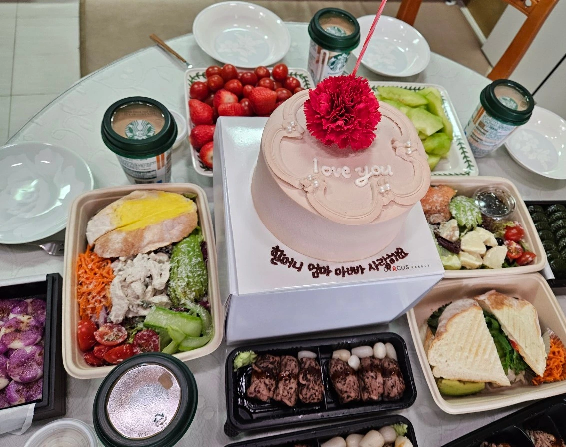 이번 어버이날은 카네이션 수제케익과 스테이크 초밥과 샐러드와 샌드위치를 주문해서 먹었다.