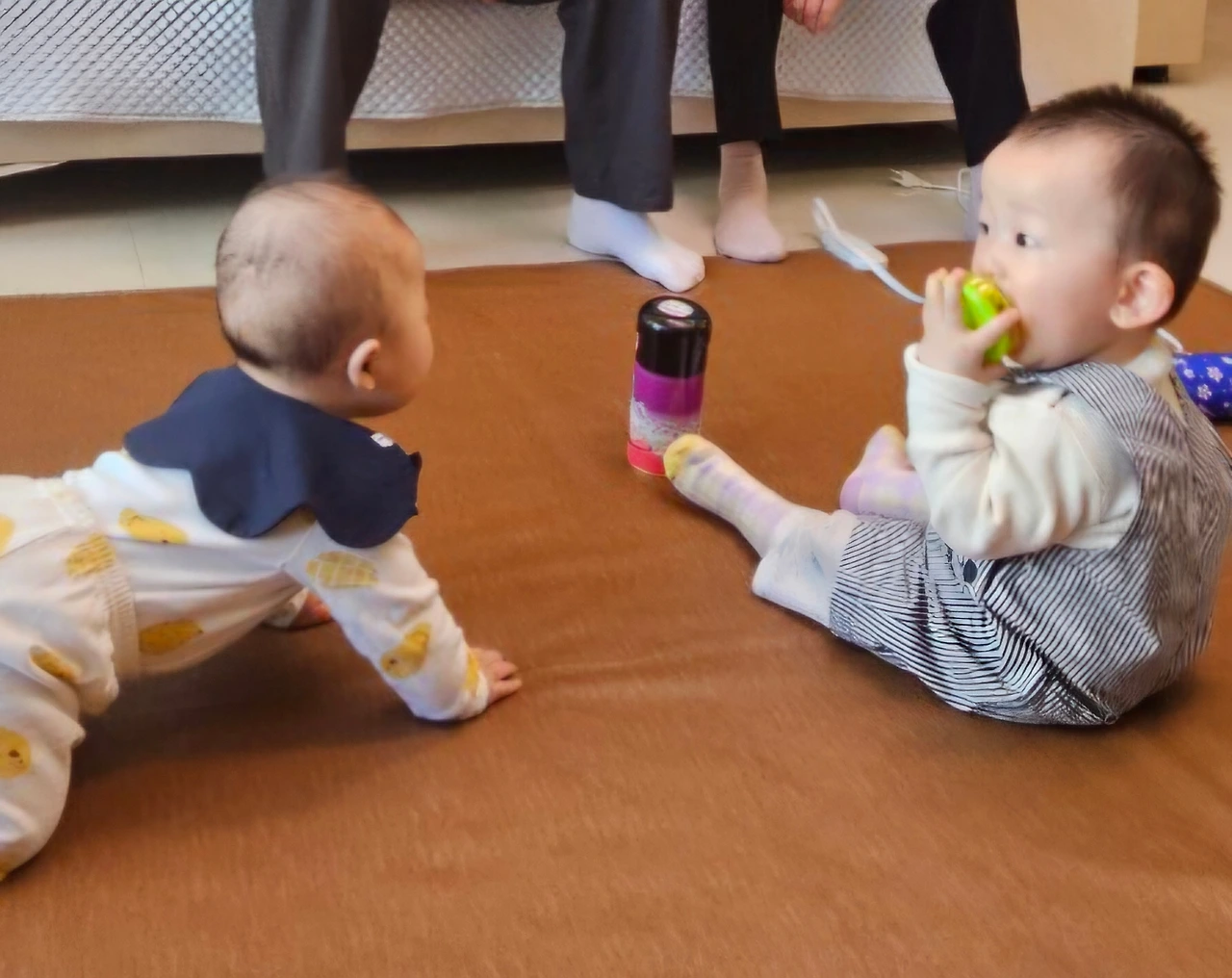 두명의 아가를 거실 가운데 놓고 아가들의 작은 움직임에도까르르 웃으며 모두가 즐거웠다.