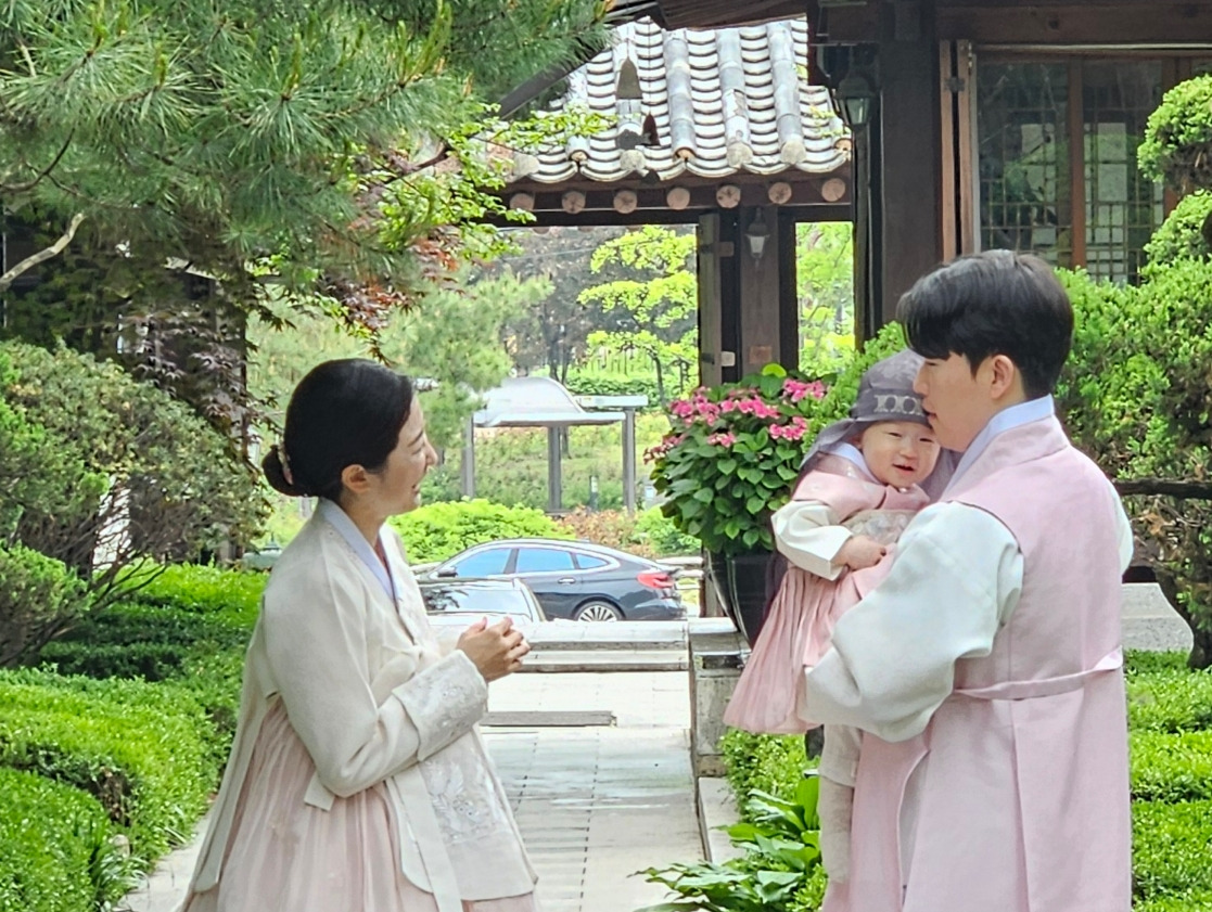 분홍한복을 입은 아가와 엄마와 아빠가 행복한 웃음을 지으며 야외에서 아가 돐사진을 찍었다.