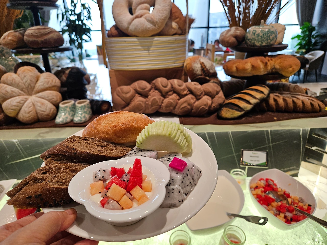 우리가 묵은 호텔이 하롱베이 근처라서 창문을 통해 하롱베이의 섬들을 보며 열대과일 아침 조식을 먹었다.