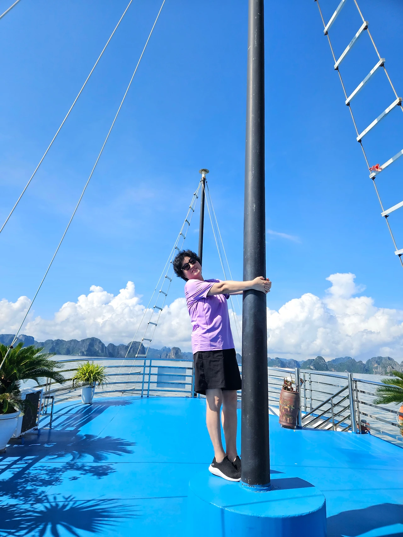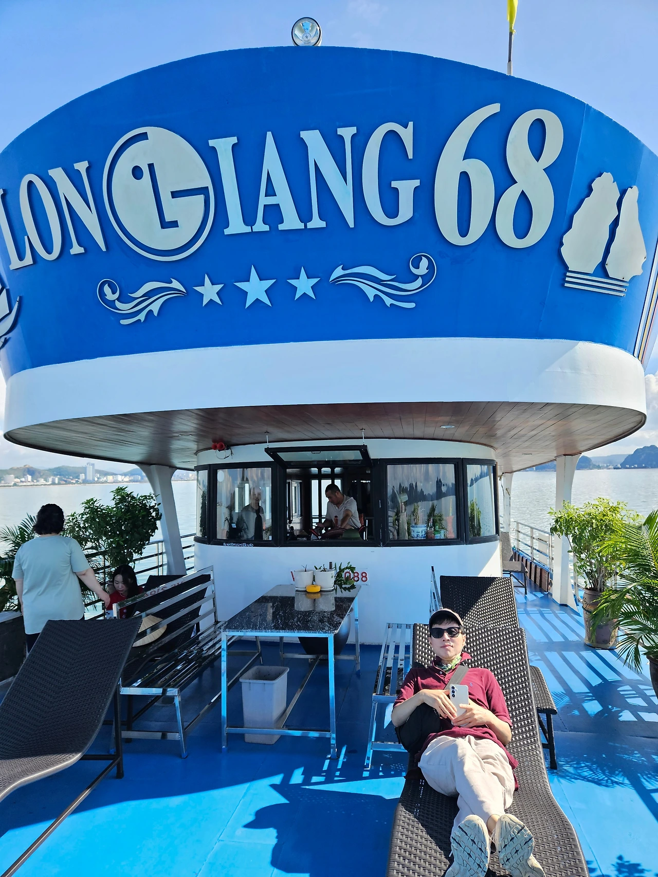 2층은 관광 포인트갑판이었다.. 파란색 배경이어서 하롱베이 풍경이 더 푸르게 보였다.