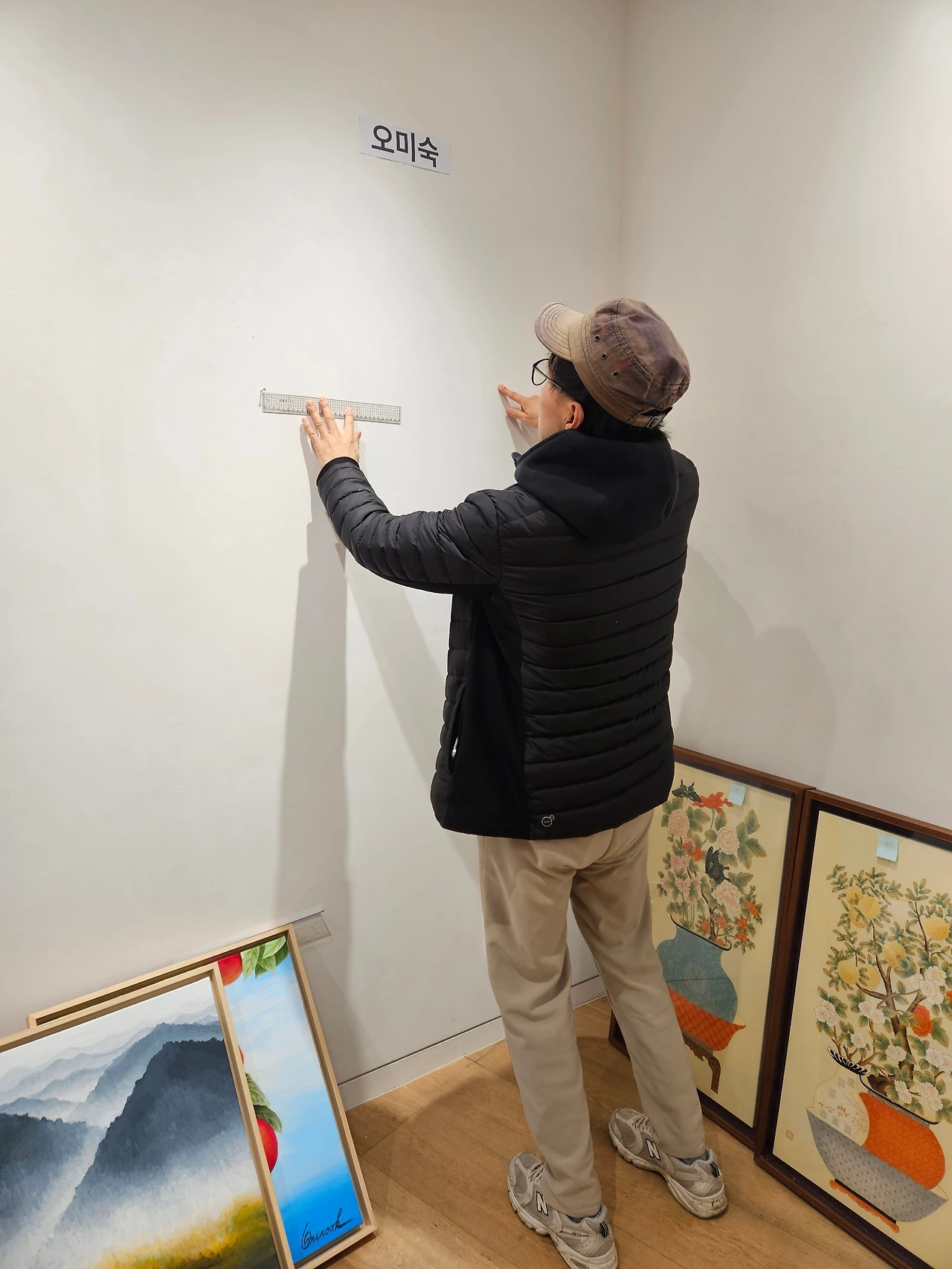 가로세로 수평 수직을 맞추고 못을 박고 하여 작품을 걸었다.