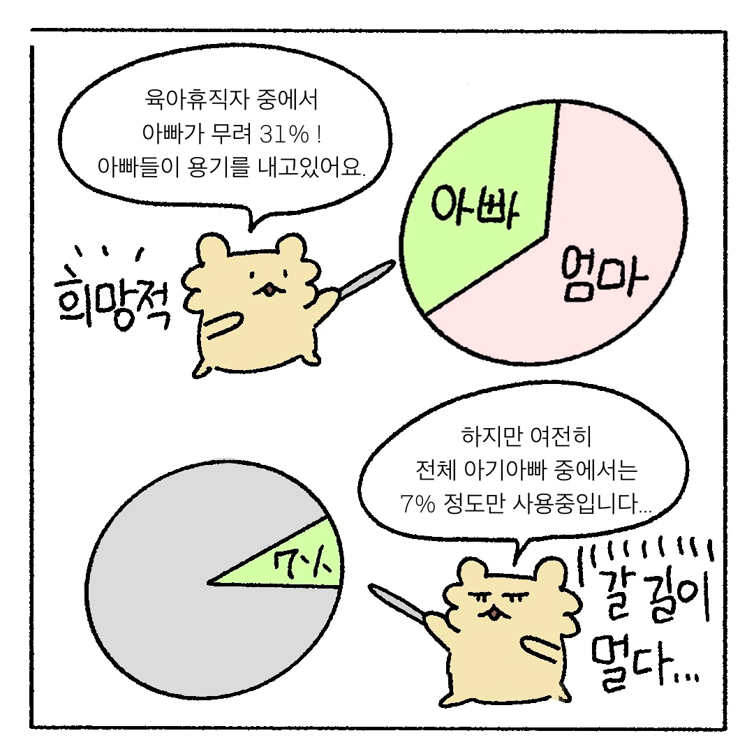 저희 회사는 그래도 여성 직원들의 육아휴직이 비교적 자유로운 편이라 다행이지만, 남자 직원 육아휴직은 여전히 '새로운 시도'로 여겨지는 분위기입니다.