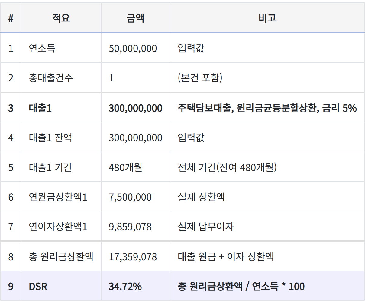 소득이 5천만원인 머니구리씨가 총 대출금액 3억원, 금리 5%, 40년 분할상환 대출을 받는다면 DSR은
