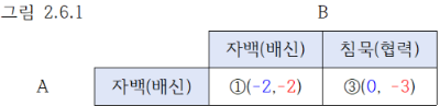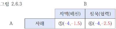 A가 자백하는 경우 B는 ①의 –2와 ③의-3 가운데 ①, 즉 자백을 선택합니다. 그림 2.6.1에서 빨간색끼리 비교죠.