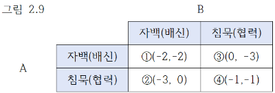 죄수의 딜레마 게임을 다시 생각해 봅시다. 죄수의 딜레마 게임의 보수행렬은 그림 2.9와 같습니다. 이는 그림 2.1을 그대로 가져온 것입니다. A의 입장에서 생각해 보면, B가 어떤 선택을 하든, 자백을 하는 것이 최선의 반응이 됩니다. 이를 우월전략이라고 했습니다. 이를 반대로 보면 침묵은 열등전략이 됩니다.