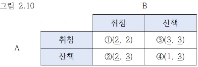 약우월전략 증, A 취침, B 산책인 ③은 내시균형이 되는 것이 분명합니다. 이는 모든 보수쌍을 통틀어 둘 모두에게 가장 높은 효용을 주는 보수쌍입니다. 그런데 우리가 약열등전략이라고 제쳐둔 ⓶의 경우, 즉 A가 산책을 선택하고 B가 취침을 선택하는 (산책, 취침) 전략조합도 내시균형입니다. 왜냐고요? 이 조합 역시 상대가 전략을 바꾸지 않는 한 자신의 전략을 바꿀 이유가 없는 조합이기 때문입니다. 우선 B는 굳이 취침을 산책으로 바꿀 이유가 없습니다. 이미 최선의 효용인 3을 얻고 있기 때문입니다. 그렇다면 A 역시 바꿀 이유가 없습니다. 산책을 취침으로 바꿔도 취침과 마찬가지의 효용인 2를 얻을 뿐이기 때문입니다. 그러니 (산책, 취침) 전략조합 역시 내시균형입니다. 뭔가 ‘어색한’ 균형이지만 내시균형임에는 분명합니다.