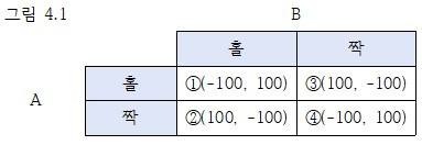B가 ‘홀’을 불렀을 때 B의 기대이득 = 100p - 100(1-p) = 200p –100 (식 4.1)