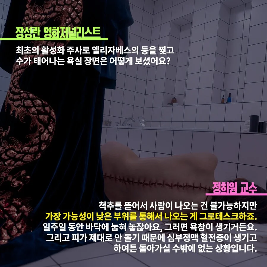 엘리자베스가 자신을 사랑해 '서브스턴스'라는 기묘한 키트를 주문하지 않았더라면. 와인 한 잔 홀짝이며 눈부신 새해를 맞이하였을지도 모르는 일이다.