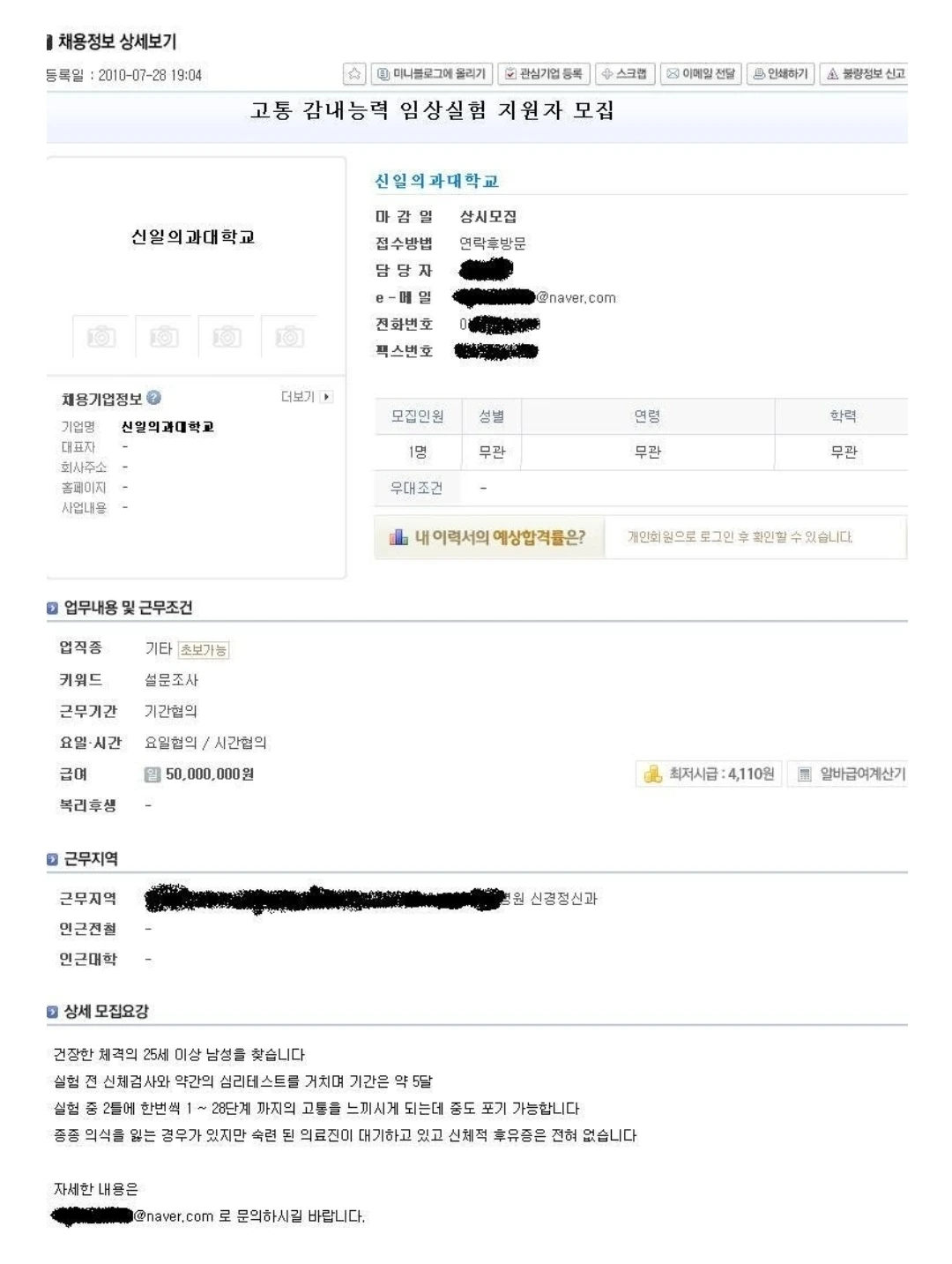 이 기묘한 구인글은 뭇 인터넷 유저들의 궁금증을 자아냈다. 건장한 남성을 뽑는 걸로 보아 장기매매다부터 시작해서 신일의과대학이란 곳은 없다는 점이 지적되기도 했고. 관련하여 팬(?)만화도 등장하고 TV에도 소개가 되었던 것으로 기억한다.