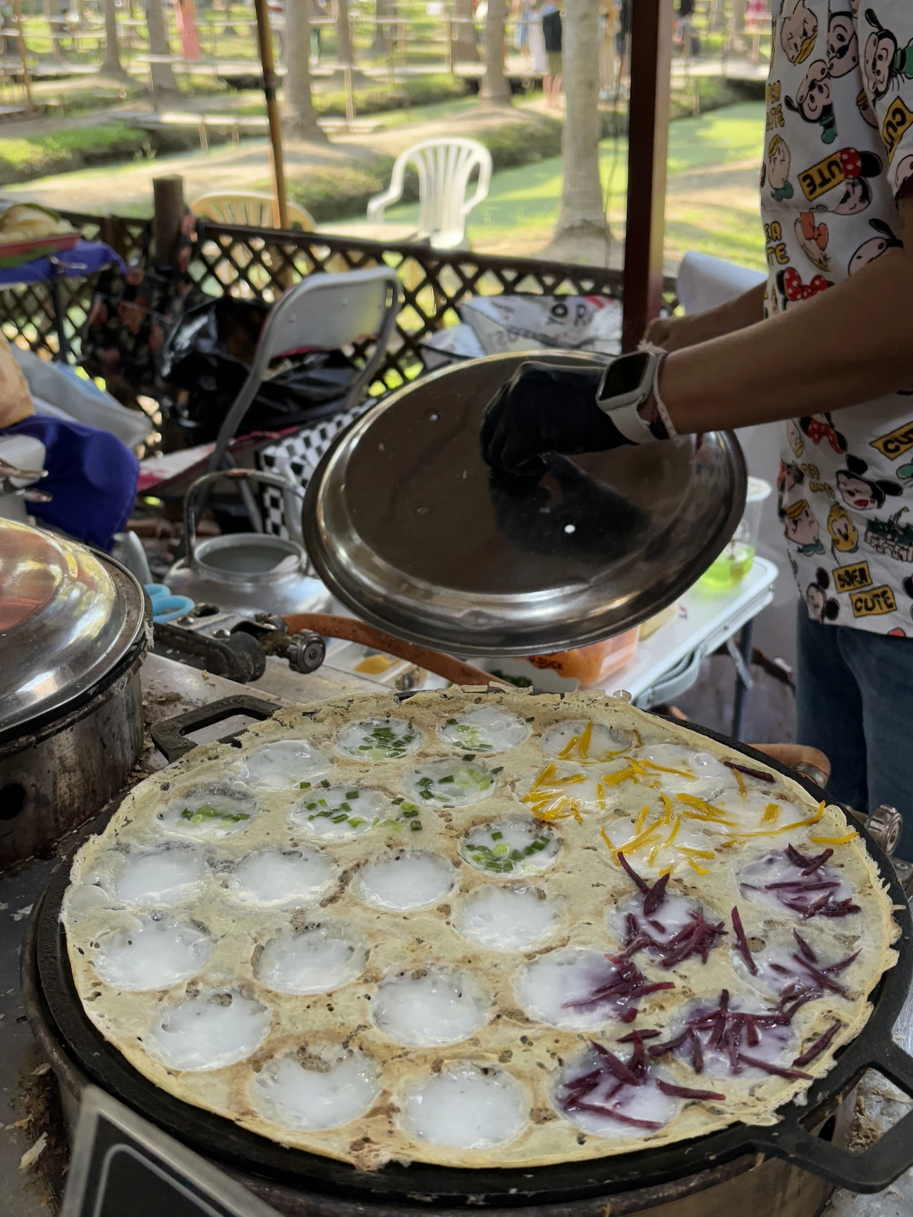 코코넛마켓에서 우리가 가장 좋아하는 간식은 카놈크록이라는 이름의 코코넛팬케이크와 코코넛아이스크림이었다. 그날도 우리는 코코넛마켓을 한 바퀴 돌며 귀여운 엽서와 마그넷을 구경하고 카놈크록을 한 그릇 샀다. 코코넛마켓의 한 구석에 서서 방금 구워져서 나온 따끈하고 부드러운 코코넛 팬케이크를 이제 막 입에 넣으려고 하던 순간이었다.