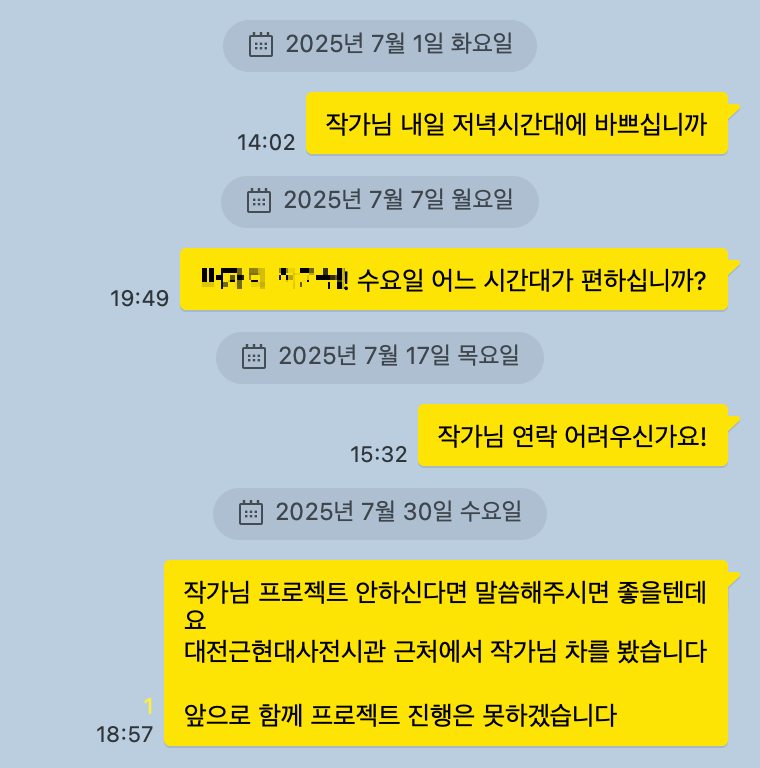 그 이후로 전화를 받지도 않으며, 카톡에 답장이 없었다. 이후에도 여전히 연락이 닿지 않아서 겹지인분과 대화를 통해 수소문해봤지만 여전히 연락은 되지 않았다. 그러던 중에 대전을 돌아다니던 중에 해당 작가님의 자동차를 발견했지만 일정이 바빠서 근처에서 대기는 하지 못하고 돌아가게 되었다. 그렇게 프로젝트를 진행하지 않는다는 이야기를 전하기 위해 마지막 카톡을 남기게 되었다.