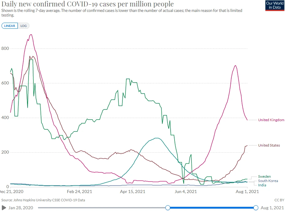 다음으로 스웨덴을 볼까요? 스웨덴은 델타 변이 확산이 증가함에도 불구하고 확진자는 긴 시간동안 정체했으며, 최근에 와서야 낮은 수준에서 증가하였습니다.