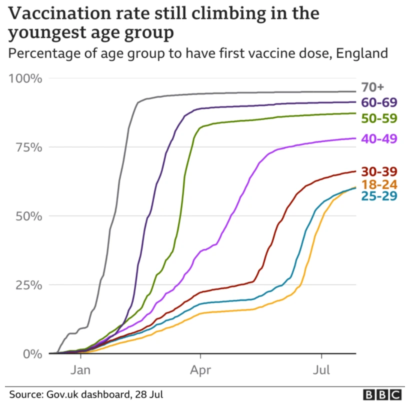 그리고 고령층의 낮은 접종률은, 앞서 델타변이로 인해 비슷한 감염 확산을 겪은 영국과 미국이 왜 사망자 수에서 서로 다른 추세를 보이는지를 설명해줄 수 있습니다.