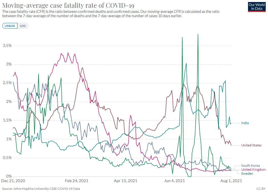 델타 변이의 확산에도 불구하고 단기사망률은 미국을 포함하여 고령층 백신 접종이 상당 수준으로 진행된 영국/스웨덴/한국 모두가 감소하는 추세이기 때문에, 델타 변이가 심각하다고 말할 수 있는 증거는 없습니다.