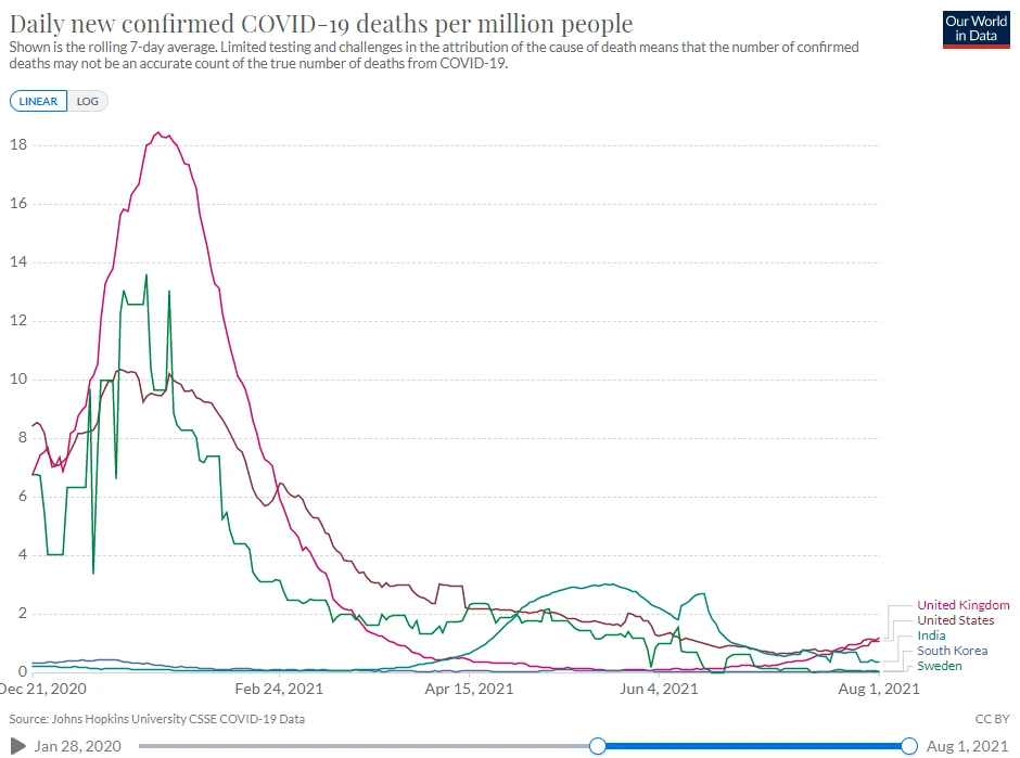 그림을 보시면 아시겠듯이, 초기 델타가 확산하던 인도를 제외하고는 델타 변이가 사망의 증가에 끼치는 유의한 영향이 보이지 않으며, 심지어 7월의 스웨덴은 델타의 급속한 확산에도 불구하고 사망자수가 한국보다 낮은 수준에 안착해버렸습니다.