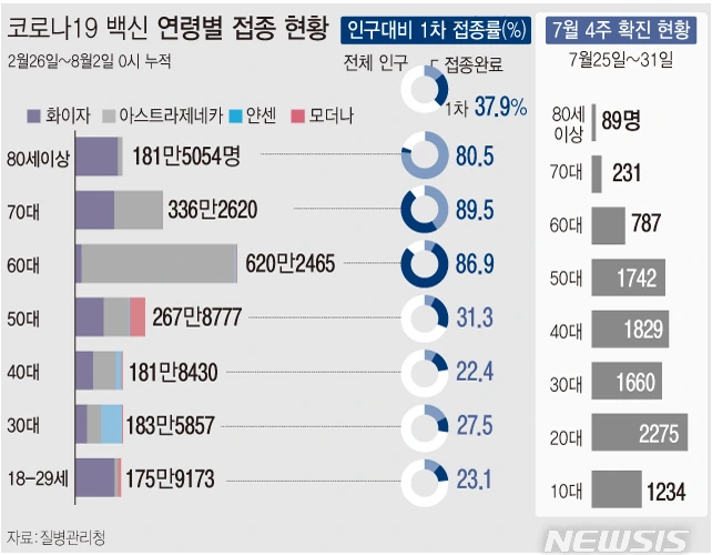 (좌) 영국의 연령별 백신접종률 (출처: BBC), (우) 한국의 연령별 백신접종률 (출처: 뉴시스)