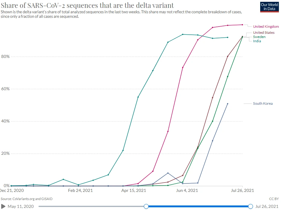 한국이 델타 변이 지배율이 50% 가량을 차지하는 것을 제외하면, 미국, 영국, 스웨덴, 인도는 이미 대부분의 감염이 델타 변이라고 해도 과언이 아닙니다.