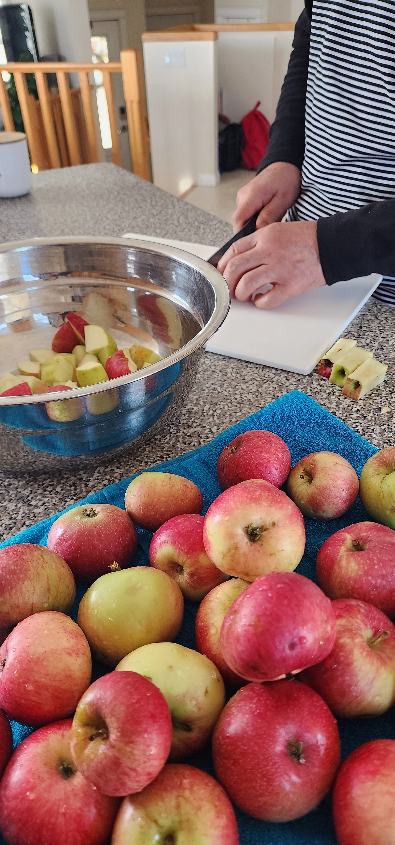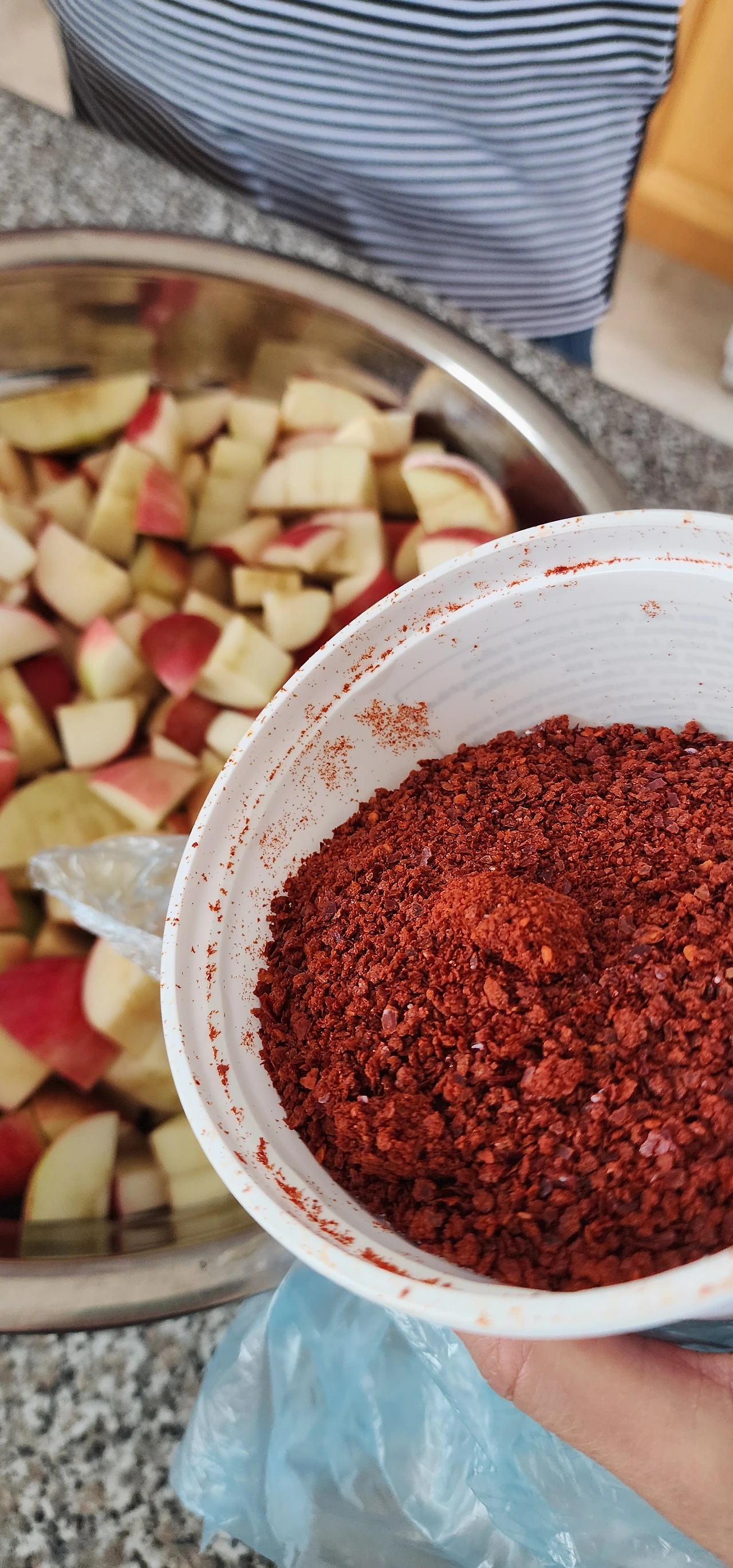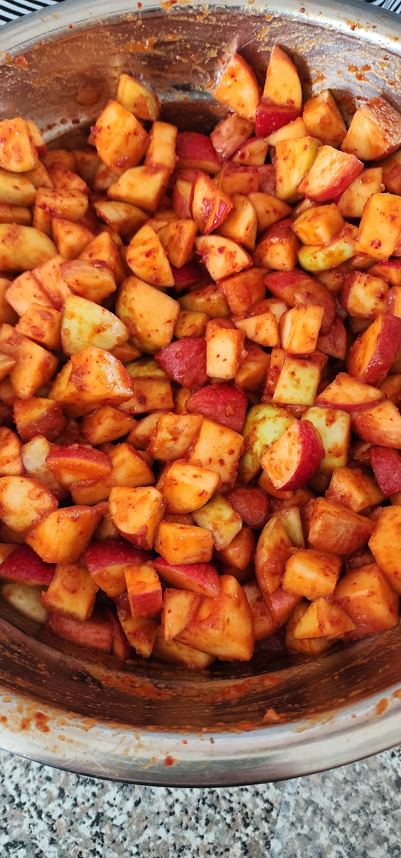 뒷마당에서 수확해 온 사과가 아직 많이 남아있어 오늘은 남은 사과로 두 번째 깍두기를 담기로 했다. 사실 꾀 큼직하게 익은 사과지만 시중에 파는 사과처럼 달고 맛있지는 않다. 이 많은 사과를 하나도 버리지 않고 먹을 수 있는 방법으로 검색해 본 것이 바로 사과김치였다. 이렇게 우리는 무모하고 용감하게 한 번도 먹어보지 못하고 담가보지도 못했던 사과 김치를 담았다. 그것도 자그마치 4리터나 되는 통으로 말이다. 갓 담가낸 사과김치맛은 제목 그대로 시큼한 사과에 김치양념을 묻혀놓은 듯한 따로 노는 맛이지만 양념에 사과육질에 베이고 숙성하게 되면 기대이상의 맛이 나올 것 같다. 페이스북 스토리에 사진을 올렸더니 외국 친구들의 관심문자가 줄줄이 이어진다. 아직 검증되지 않은 맛이므로 내년에 조금씩 나눠주는 걸로~