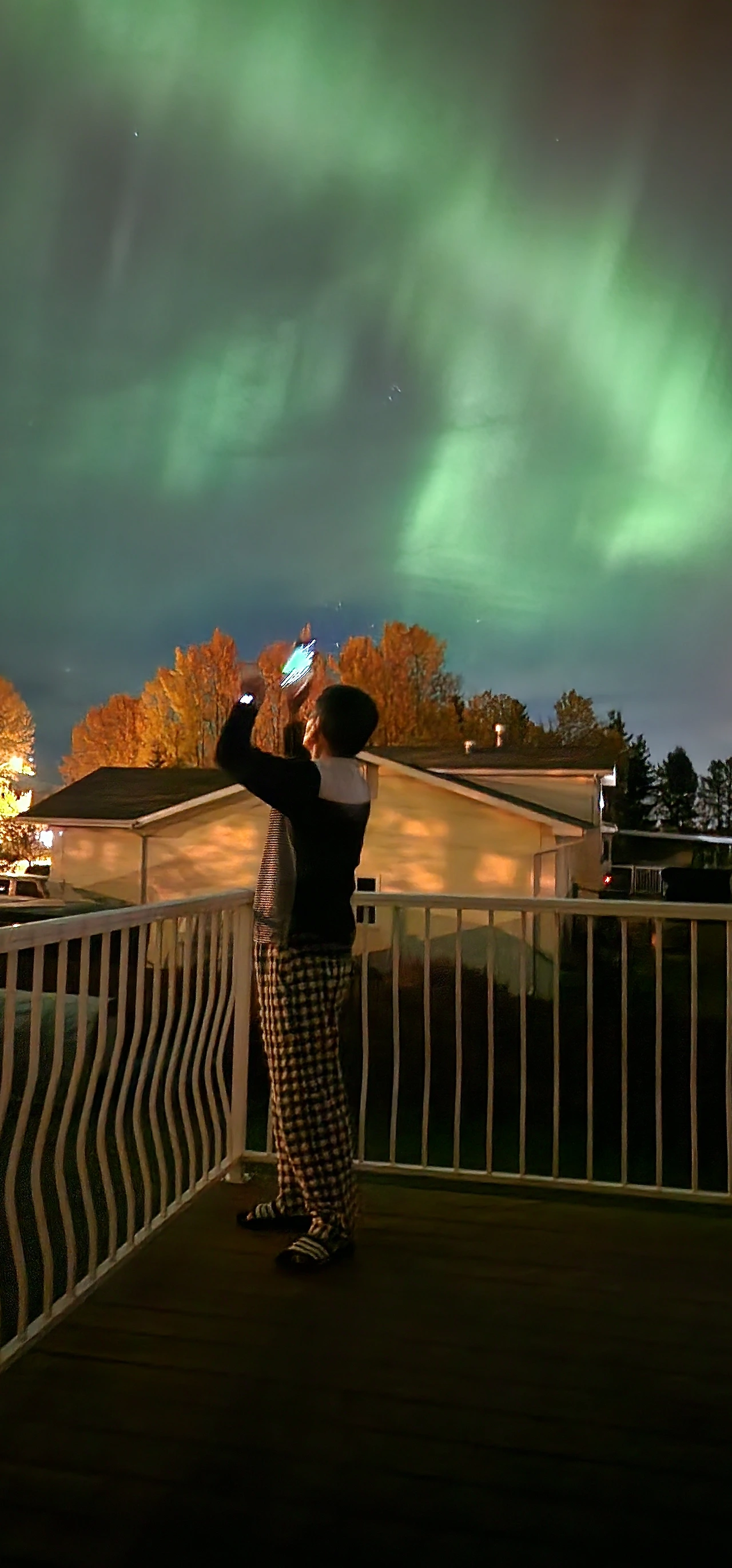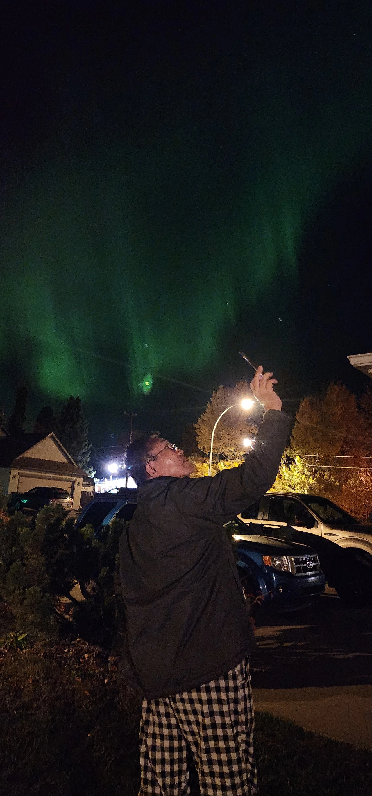 엄청나게 큰 오로라가 우리 집 전체를 덮고 있었다. 앞마당 주차장에서도, 뒷마당 데크에서도 화려한 오로라 향연이 펼쳐졌다. 선배 언니가 캐나다에 놀러 와서 오로라를 처음 본 순간 "하나님! 맙소사!"를 연발했다고 하시더니 정말 쩍 버러 진 입을 다물수 없을 정도로 신비한 순간이었다. 이 멋진 풍경을 어떻게든 카메라에 담으려고 이리저리 움직이시는 아빠의 손놀림이 바빠졌다. "우와!" 감탄사를 연발하는 아빠 보니 추운 알버타 시골마을에 사는 것도 나쁘지 않다는 생각까지 들었다.