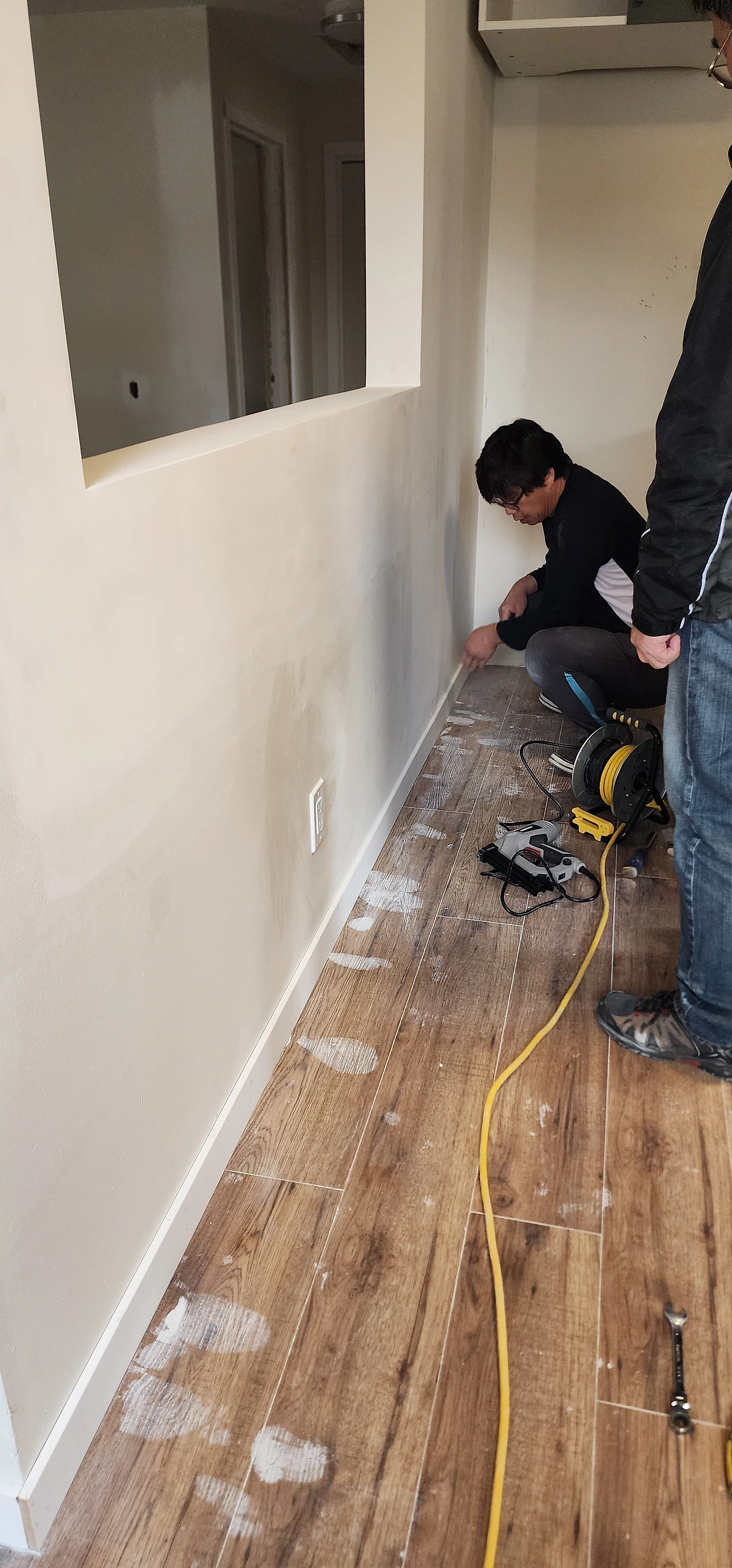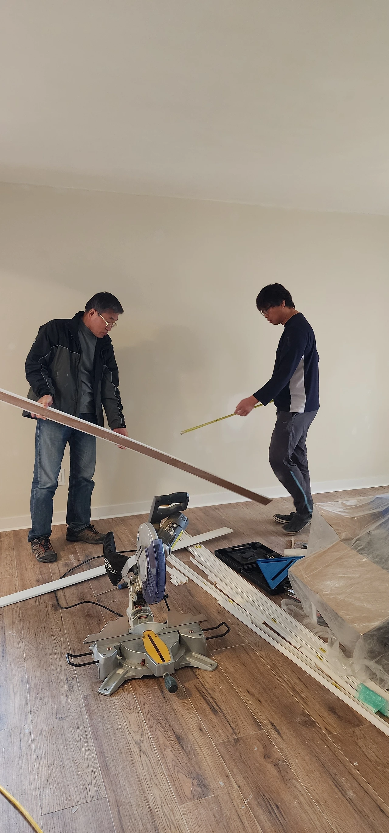오늘의 작업은 바닥 몰딩이었다. 정확한 공구 이름을 모르겠지만 못을 박아주는 총을 구입했다. 난 망치총이라고 부른다. 처음으로 총을 든 신랑은 무릎을 꿇고 앉아 몰딩위로 총을 쏘기 시작했고, 신랑의 뒤를 따라 아빠는 작은 망치(사실 망치가 없어서 밴치 같은 걸 사용하셨음)를 사용해서 미처 다 들어가지 않고 튀어나온 못을 깔끔하게 박아 넣으셨다. 사위 뒤로 나란히 함께 무릎을 꿇고 말이다. '장인어른과 베짱이 팀'의 뒷모습이 얼마나 조심스럽고 경건한지 물어보고 싶은 말을 차마 물어볼 수 없었다.