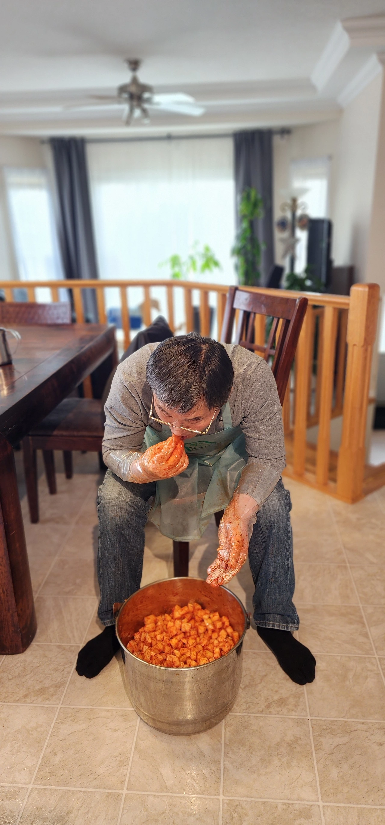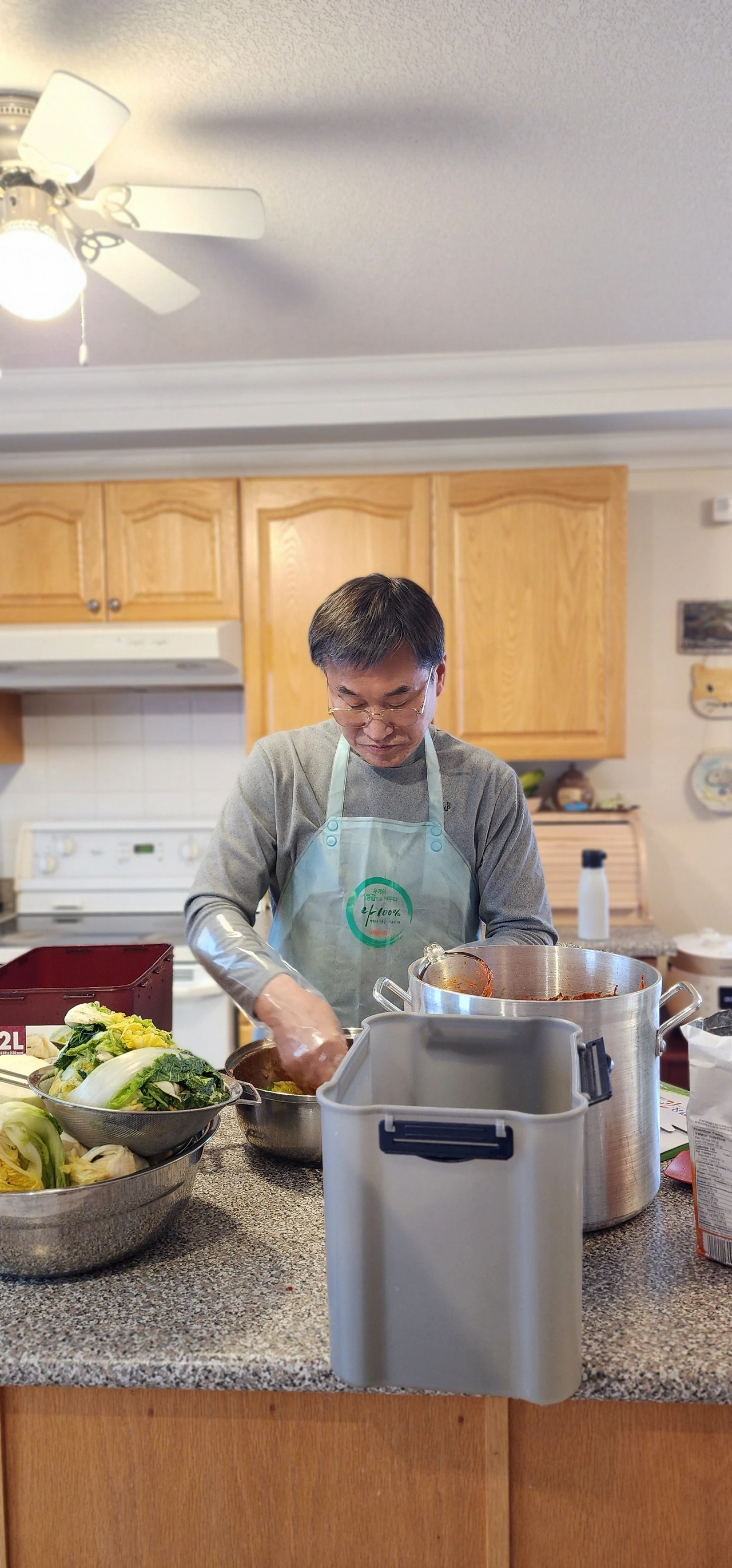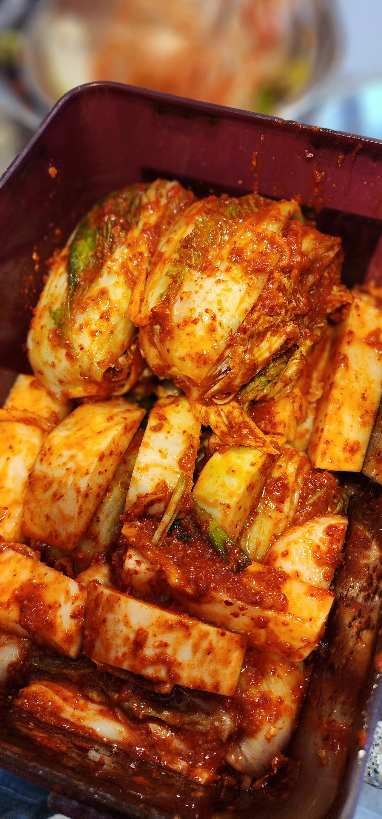 오늘은 김장하는 날! 캐나다에서 김장이라니 꿈만 같다. 김치를 소금에 절일 수 있는 큰 양동이도, 소금도, 고춧가루도 그리고 무엇보다 경험도, 손맛도 없는 나에게 있어서 아주 의미 있고 중요한 날이기도 하다. 김치가 냉장고에 다 들어가지 않을 것 같지만 이 좋은 기회를 놓칠 수 없어 배추 한 박스와, 무 한 박스를 주문했다. 이미 부엌은 배추와 무 만으로도 꽉 찬 것처럼 보인다. 혼자였다면 절대 시작하지 않았을 김장을 아빠의 지휘하에 용감하게 도전해 본다. 10년 만에 집안에 김치양념 냄새와 군침 도는 보쌈고기 냄새가 진동한다.