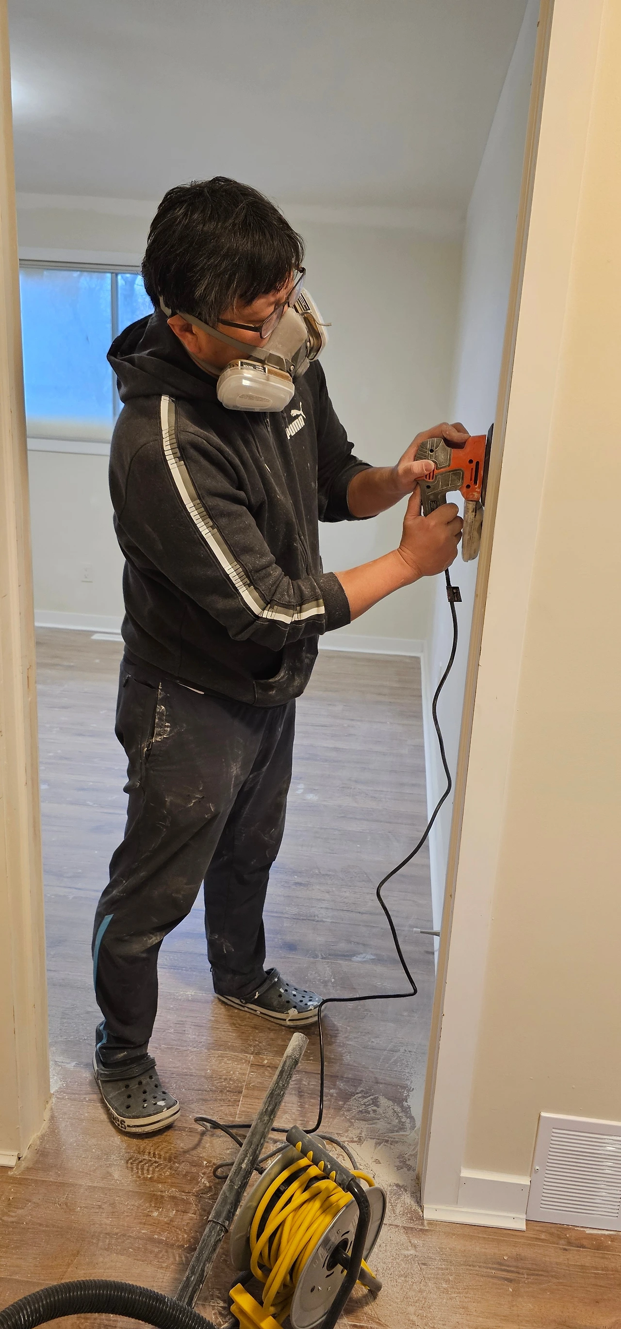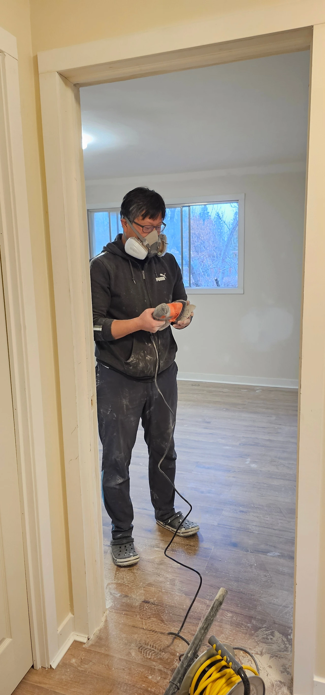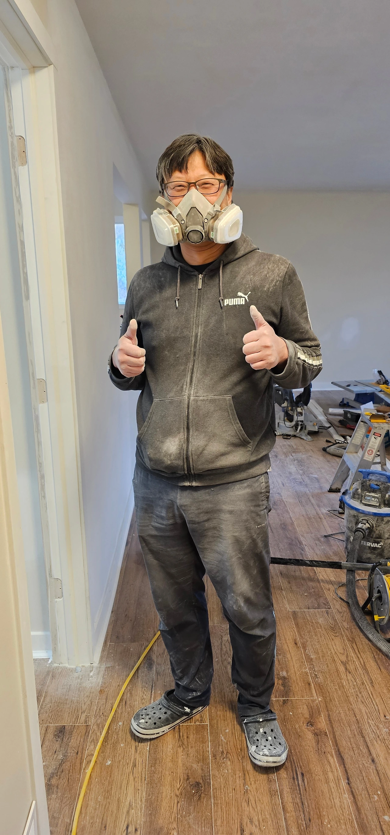 분명 페인트 작업을 한다고 했는데 이토록 먼지를 뒤집어쓰고 있는 이유는 바로 샌딩 때문이다. 문틈, 즉 문과 기둥사이에 공간을 필러로 메꿨기 때문에 페인트를 칠하기 전 매끈하게 갈아 주어야 한다고 한다. 어쩌면 이 글을 읽고 있는 전문가분이 계시다면 "어이구, 사서 고생을 하는구먼! 저렇게 까지 안 해도 되는데"라고 하시며 답답해하실 수도 있겠다.