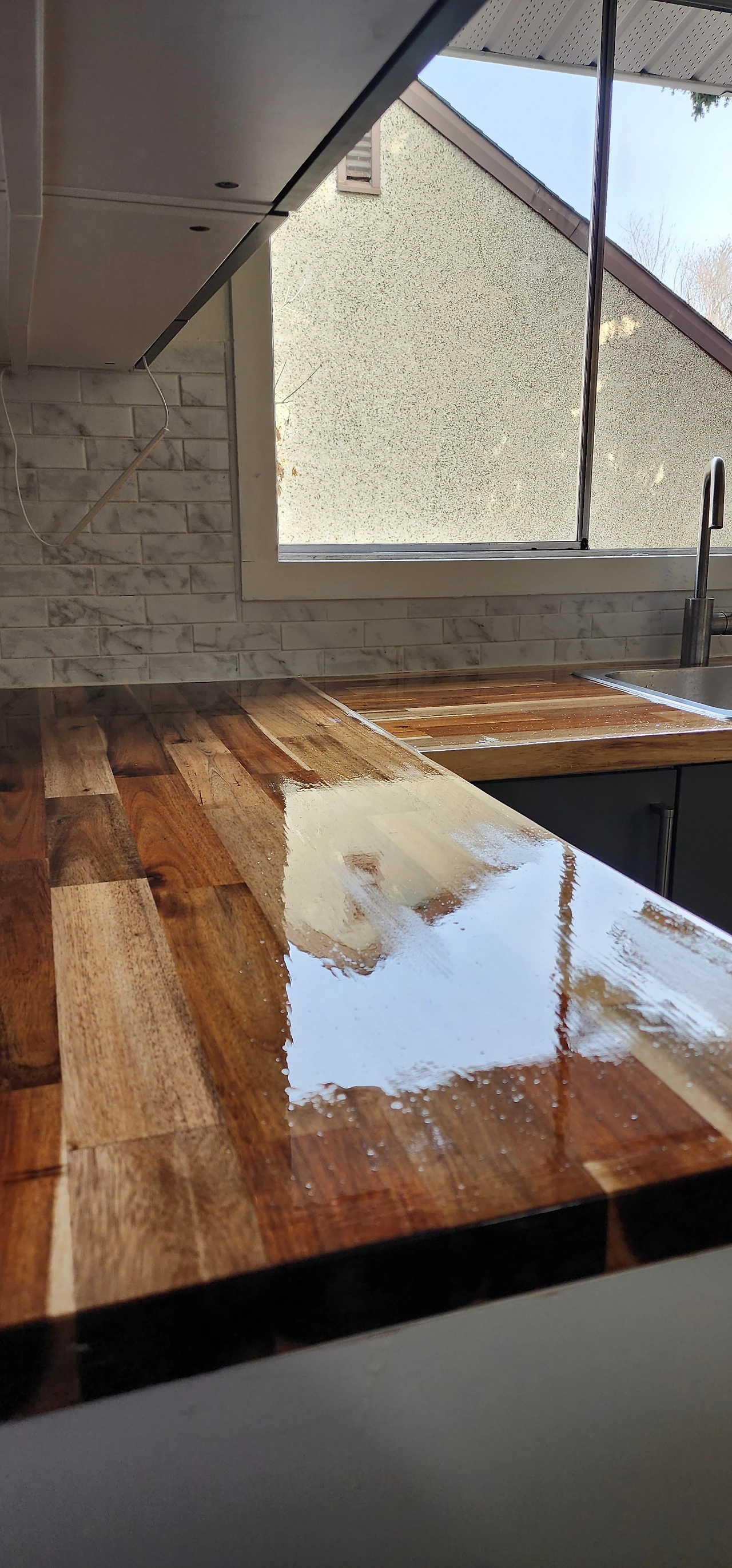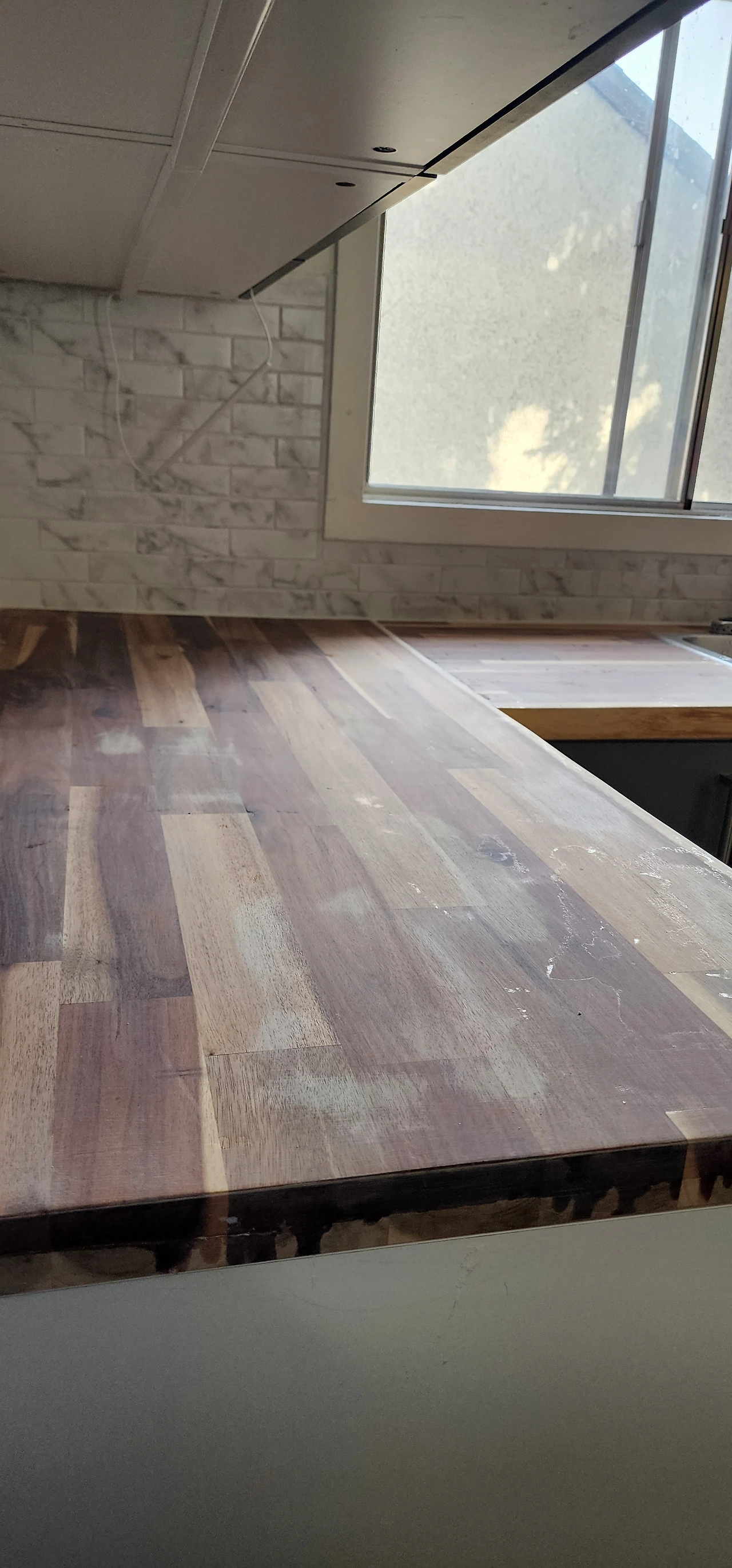 오일과 코팅역할을 하는 마감재를 사용해서 부엌 카운트 탑도 마무리했다. 존이 에폭시로 마감을 하기 전에 떨어진 페인트나 글루를 제대로 제거하지 않았기에 카운터 탑이 마치 창고 작업실처럼 지저분했었다. 어쩔 수 없이 샌딩머신으로 깨끗이 표면을 벗겨낸후 다시 마감작업을 했다.