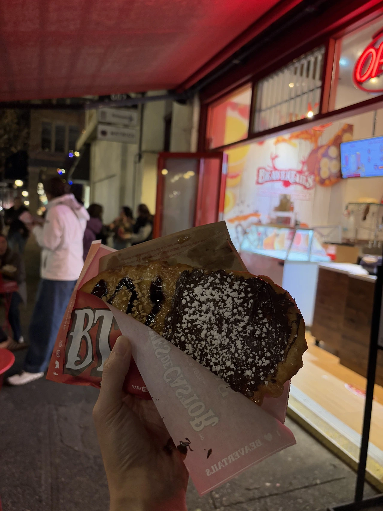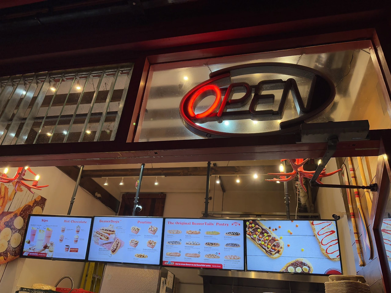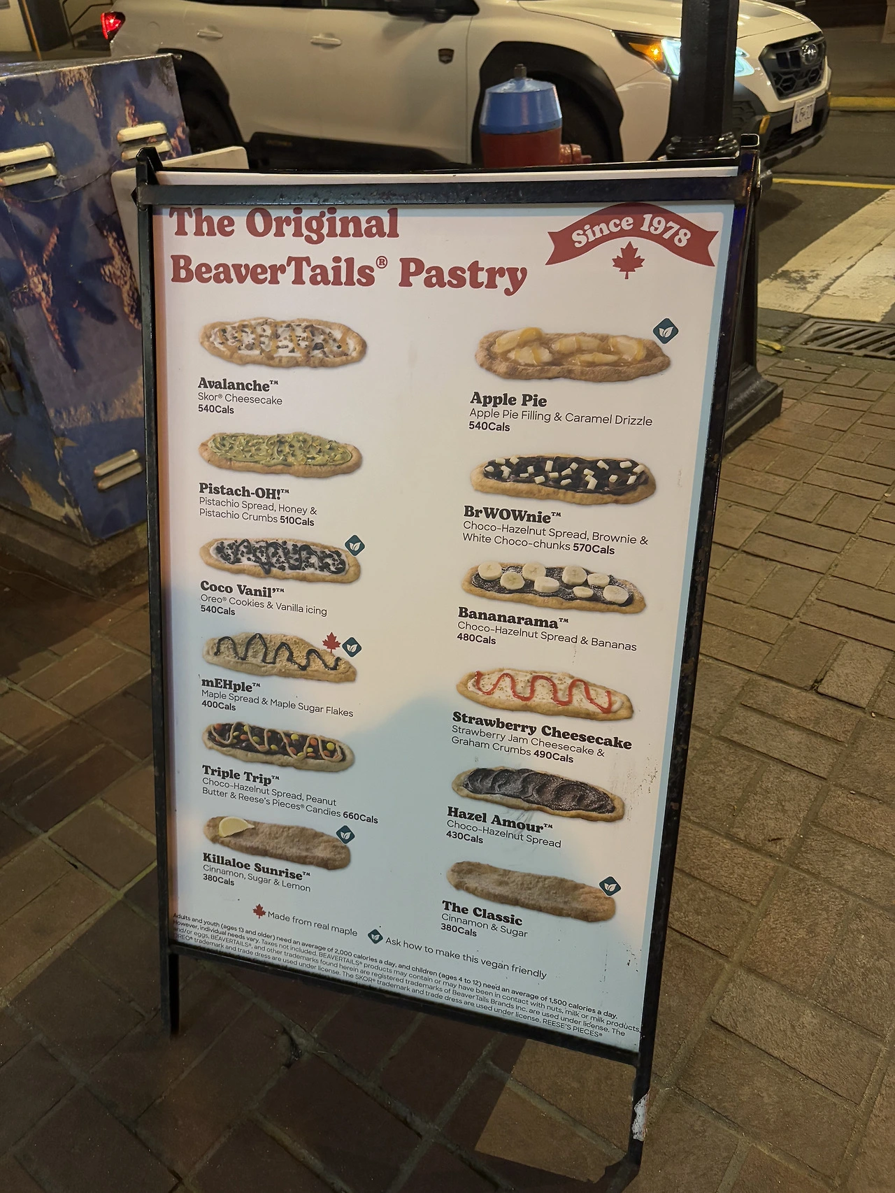 캐나다 국민 간식 비버테일. 우리나라 꽈배기를 납작하게 눌러 튀기고 그 위에 다양한 스프레드를 발라서 먹는 음식. 초코 헤이즐과 메이플 반반 씩 맛봤는데 엄청 달았다. 예상가는 맛 그대로 맛있다.