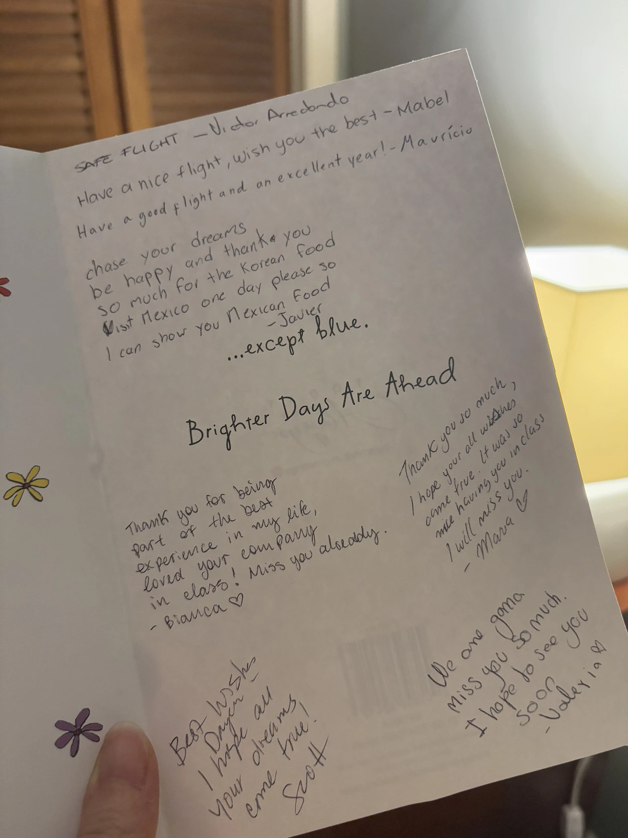 일출과 함께 하는 어학원 마지막 날. 같은 반 친구들로부터 생각지 못한 편지와 선물을 받았다. 나도 무언가 준비할까 했는데 고작 2주에 내가 너무 유난인것 같아서 간단하게 인사만 했는데 내가 조금 작게 느껴졌다. 이번에는 각국의 특히 남미 친구들과 이야기할 기회가 많았는데, 그동안 가지고 있던 다른 나라에 대한 인식들이 많이 바뀌었다. 콜롬비아 초콜릿과 귀여운 마그넷, 마음이 참 고맙다.
