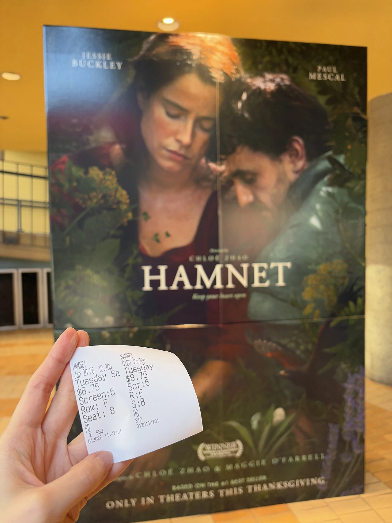 마침 화요일이라 영화를 보러 왔다. 화요일에는 9천 원, 할인된 가격에 영화를 볼 수 있다. 셰익스피어원작 햄넷을 봤는데 몸이 노곤해서 초반부에 졸았다. 그리고 아직 영어공부를 더해야겠다는 생각이 들었다. 줄거리를 대강 공부하고 가서 다행이었다.