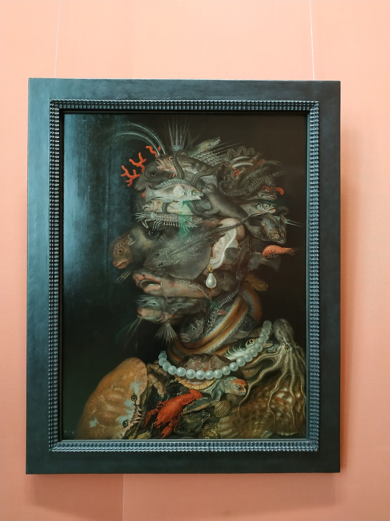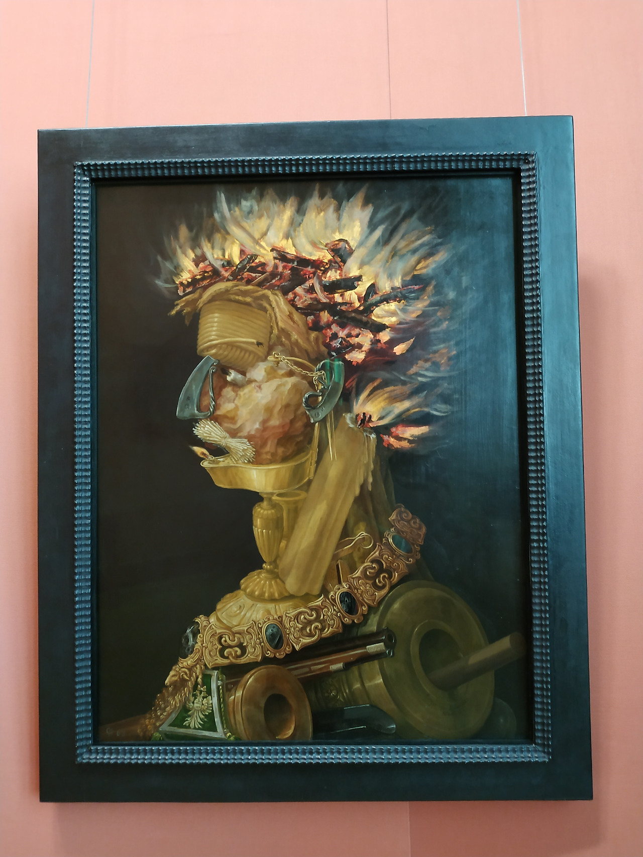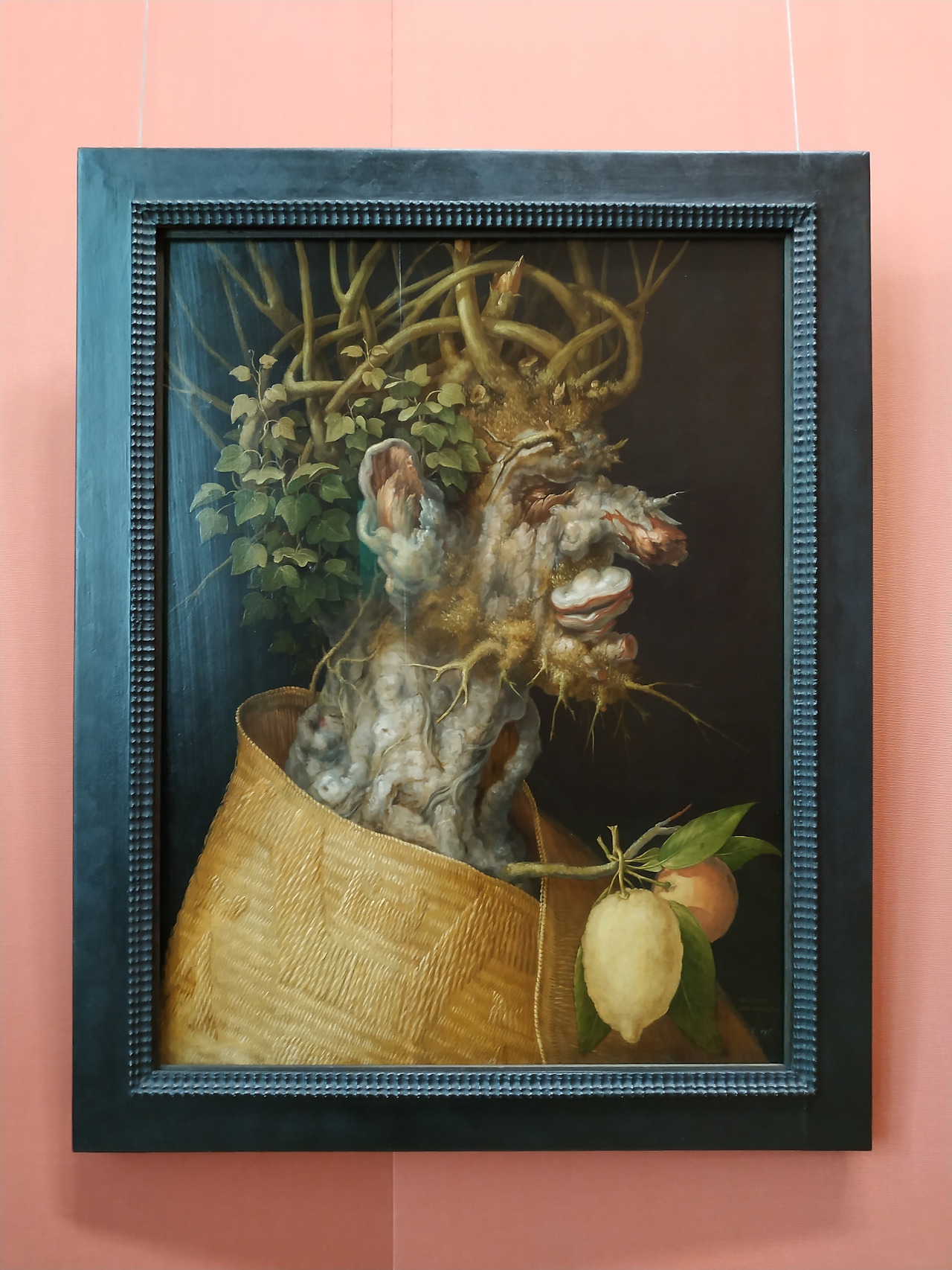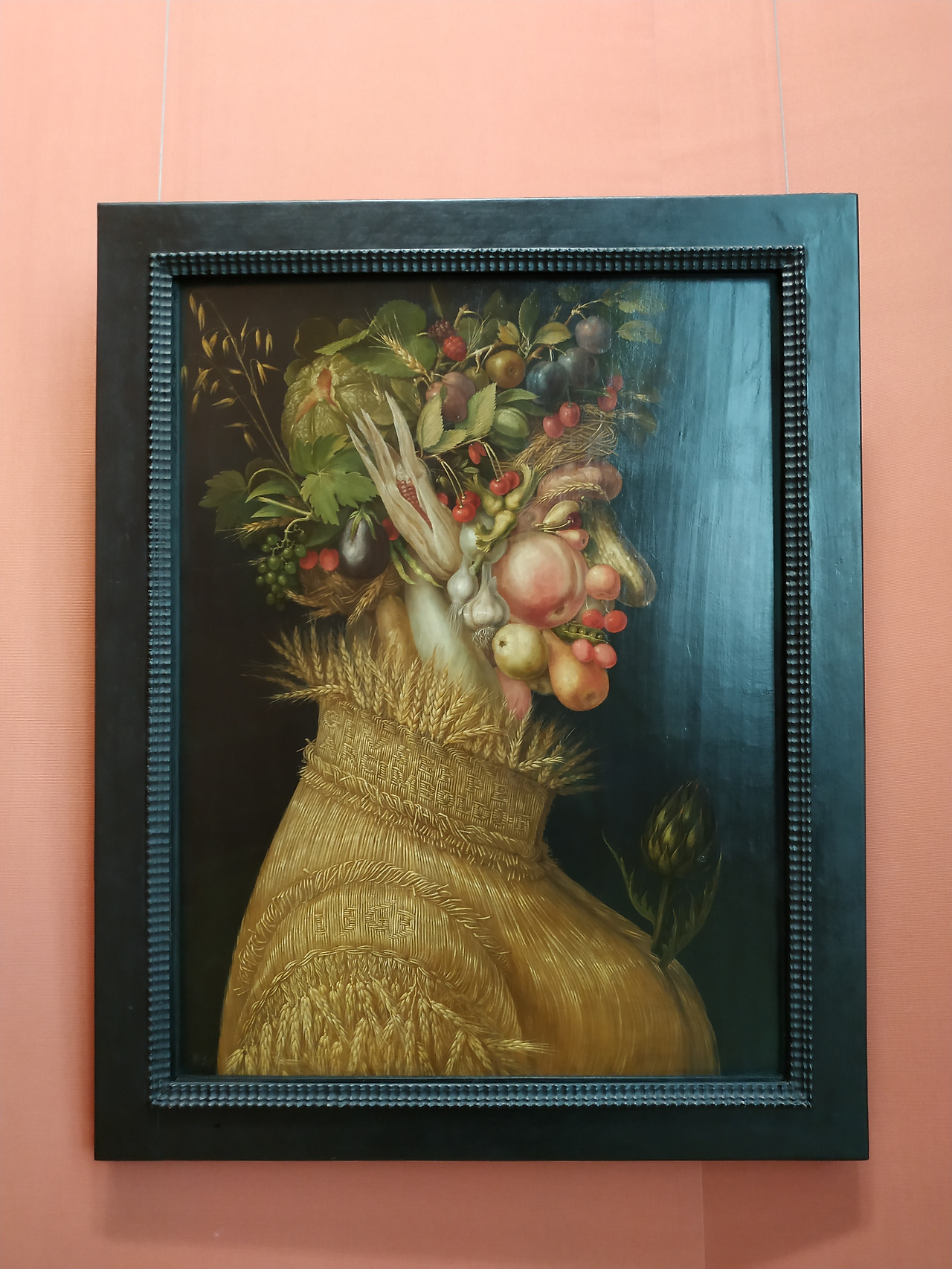 박물관에는 네 작품이 연달아 걸려 있었다. 모두 다 사람 얼굴이긴 한데 매우 특이했다. 가까이 가서 보니 표현 방법이 엄청났다. 얼굴과 머리가 모두 과일과 채소로 이루어져 있었다. 눈은 체리, 코는 호박, 뺨은 복숭아, 광대뼈는 마늘, 이빨은 완두콩, 턱은 배다. 그리고 머리카락은 포도, 가지, 각종 베리 종류들로 표현했다. 아니 어떻게 이런 기상천외한 생각을 할 수 있었을까! 이 천재가 누군지 궁금했다. 설명을 보니 주세페 아르침볼도라는 화가가 그린 <Summer>라는 작품이었다. 합스부르크 왕가의 궁정화가로 활동하던 1563년에 이 그림을 그렸다고 한다. 짚으로 표현된 목과 어깨에 이름(Giuseppe Arcimboldo)과 연도(1563)가 쓰여 있다는 설명을 읽고 자세히 보니 진짜 있다. 와!! 대단하다는 말 밖에 할 수가 없었다.