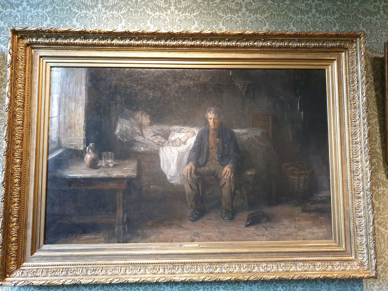 이전 포스팅에 언급한 <Children of the See>를 그린 네덜란드 화가 Jozef Israels의 작품이다. 가구라고는 낡은 침대와 협탁, 그리고 침대 위 선반 밖에 없는 가난한 집이다. 환한 창 밖과 달리 방안은 어두컴컴하기만 하다. 죽은 아내가 침대 위에 누워 있고 남편은 눈물조차 나오지 않는 멍한 표정으로 앉아 있다. 아내는 사망한 지 좀 됐는지 팔목 색깔이 이미 시퍼렇게 변했다. 없는 살림에 그나마 부부가 정붙이고 사는데 한 명이 먼저 세상을 떠났으니 남아 있는 한 사람은 얼마나 마음이 아릴지.