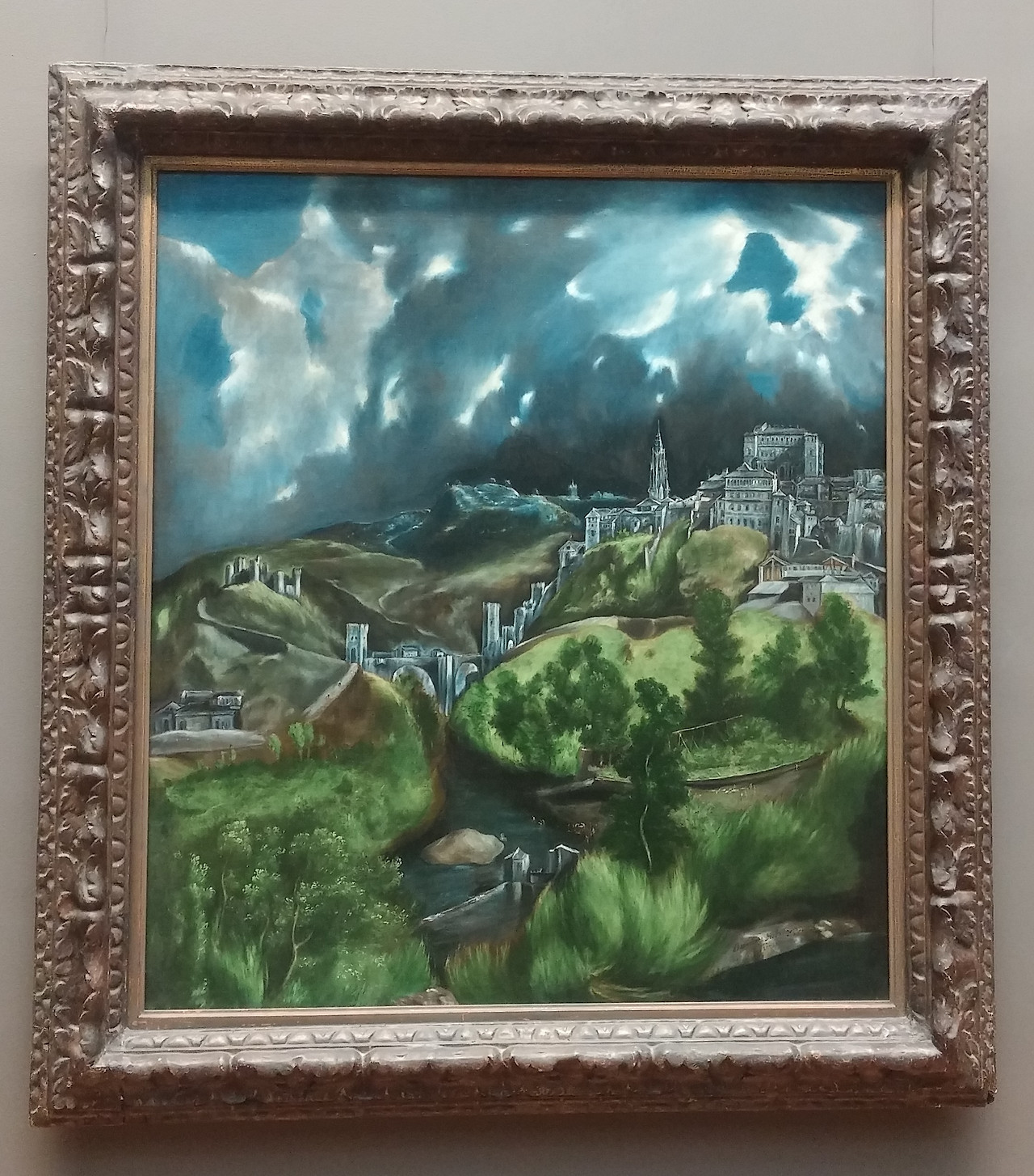 일단 하늘이 어둡고 번개가 치는 듯 하다. 금방이라도 폭우가 쏟아질 기세다. 초록의 들판도 고즈넉한 여유가 느껴지지 않는다. 왠지 사람들은 이미 죽거나 사라지고 좀비들만 득시글대는 미래세계 같다. 이 작품 또한 르네상스 거장들과 다른 화풍으로 가겠다는 의도인지, 아니면 고흐 말년 작품들처럼 엘 그레코도 정신적으로 불안해서 이렇게 그린 건지는 모르겠다. 어쨌든 우리에게 익숙한 평화로운 풍경화와는 거리가 멀다. 신기한 것은 Toledo란 도시는 시간이 멈춘 듯 엘 그레코 때와 지금의 모습이 전체적으로는 매우 비슷하다.