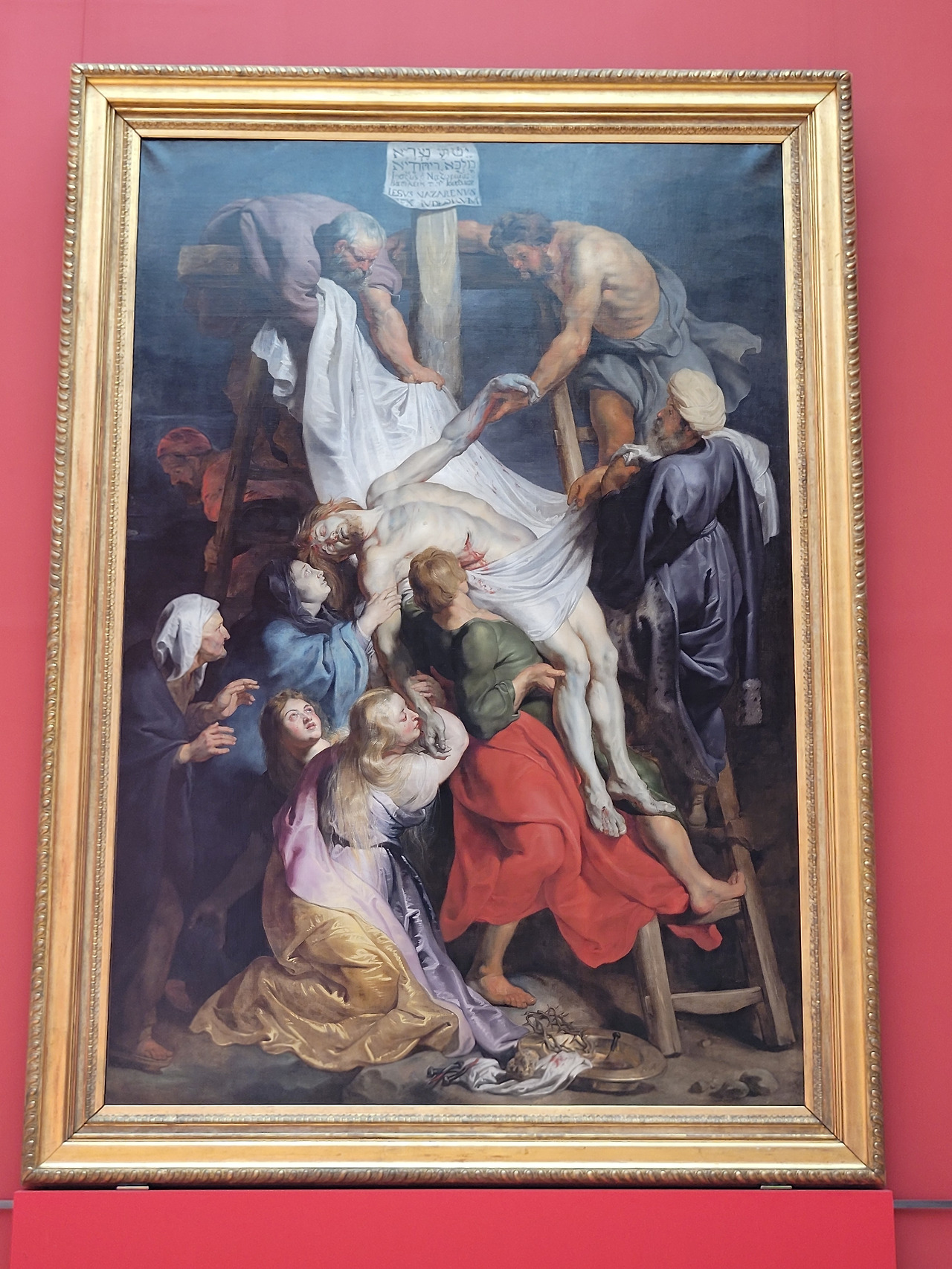 흥분을 가라앉히고 관람객 모드로 찬찬히 그림을 들여다 봤다. 일단 차분하고 잔잔한 느낌은 아니다. 화려하고 역동적이다. 붓터치가 생생하게 살아 움직이는 것 같다(이런 걸 책에서는 바로크 스타일이라고 한다). 내용을 떠나 구도 자체가 좀 불안해 보인다. 아마도 우상단에서 좌하단으로 이어지는 대각선 구조라서 그런가 보다. 중앙에 있는 예수님 몸에 집중적으로 빛이 비친다. 강한 명암의 대비로 유명한 이탈리아 카라바조의 느낌도 난다. 나중에 찾아보니 루벤스가 이탈리아 여행을 막 다녀온 후에 그린 그림이라 한다. 그럼 당연히 카라바조 영향을 받았겠지. 뭔가 맞춘 듯 해서 약간 뿌듯했다. 예수님 몸이 축 늘어진 모습이 사실적이다. 성경에(요한복음 19:34) 로마 군인 하나가 창으로 예수님의 옆구리를 푹 찔렀다고 쓰여 있던데 그림에도 오른쪽 옆구리가 핏자국으로 흥건하다. 사다리 아래에 있는 통이 예수님 핏물 받는 통이라고 한다. 한 가지 특이한 것은 고행을 거친 예수님이라면 비쩍 마르고 왜소한 모습이 더 현실적이었을텐데 루벤스는 근육질 몸짱으로 표현했다. 영화의 한 장면처럼 극적인 효과를 강조하는 바로크풍을 고수하느라 그랬을까.
