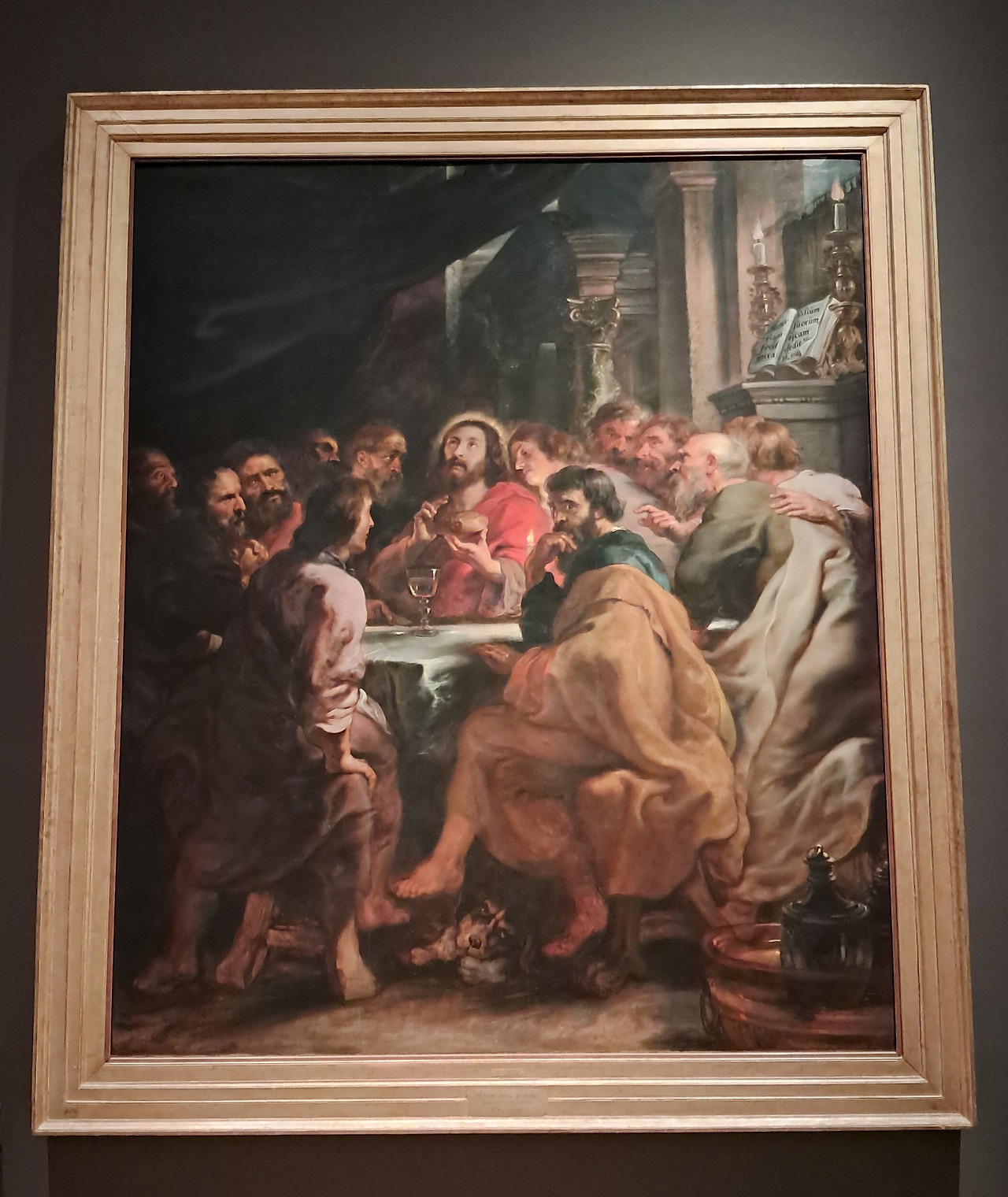 다빈치 작품이 수평적으로 안정적인 구도를 보이는 반면, 루벤스 작품은 예수님을 중심으로 제자들이 둥그렇게 앉아 있다. 어두운 배경과 밝은 식탁의 대비가 드라마틱한 장면을 연출하고, 루벤스 그림답게 붓질이 전체적으로 꿈틀거리는 것 같다. 다른 제자들은 예수님의 발언에 깜짝 놀라 웅성대지만 맨 맨 앞에 있는 유다만 자신이 배신자임을 들킨 것이 찔리는 듯 불안한 눈빛으로 관람자를 바라보고 있다. 유다 발 밑에 있는 개도 눈빛이 영 맘에 안든다. 보통 그림 속 개들은 사랑스러운 모습인데 이 작품 속에선 늑대의 눈처럼 매우 무섭고 사악하기까지 하다.