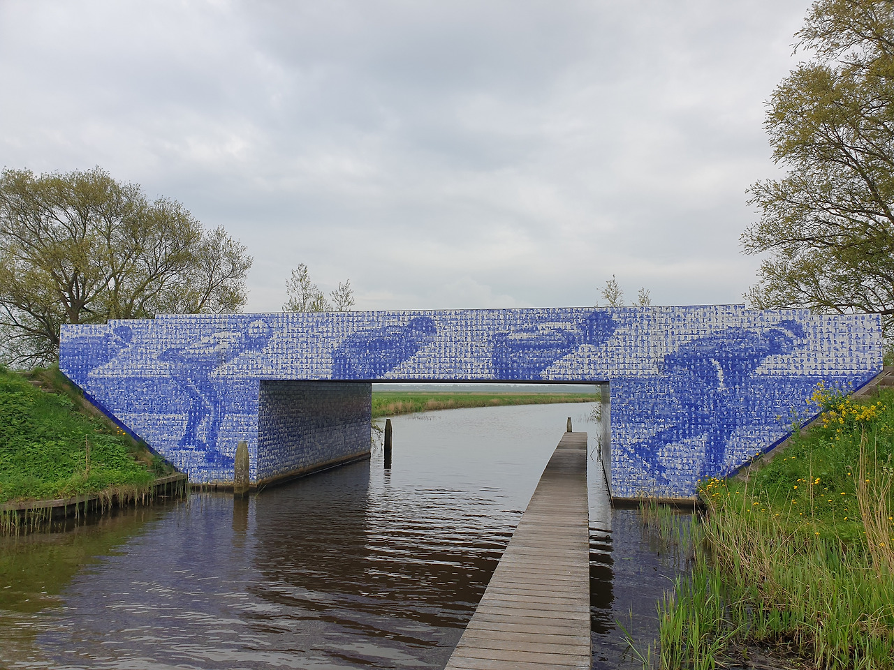 프리슬란드 주도에 있는 대회 기념비와 우승자 명단(좌), 선수들이 지나가는 수로 위 다리(중), 다리에는 역대 참가자사진이 타일로 붙어 있다(우).