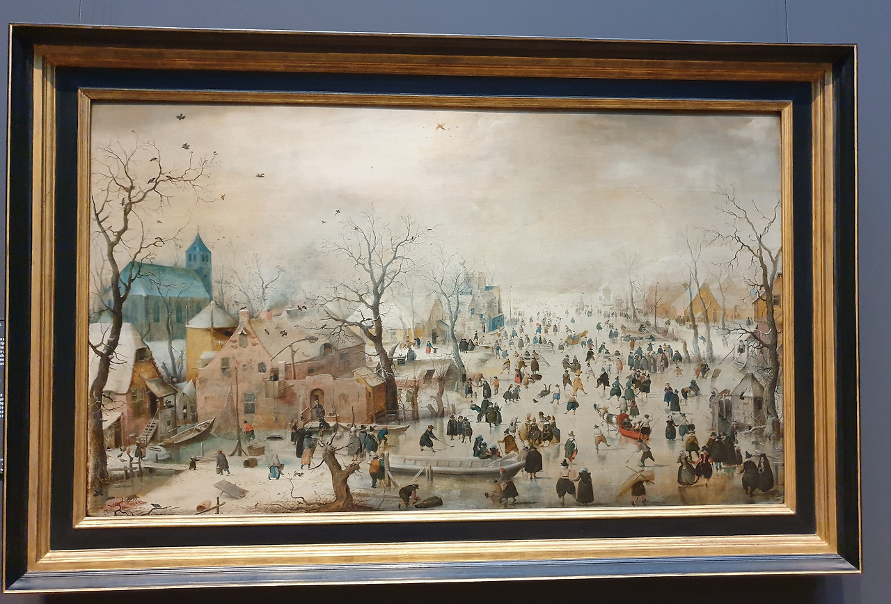 전체적인 느낌이 두번째 포스팅 그림이었던 Pieter Bruegel의 <아이들의 놀이>와 유사하다. 넓은 공간에 많은 사람들이 있고 유쾌한 분위기를 연출하고 있으며 위에서 아래로 내려다 보는 뷰까지 매우 비슷하다. 둘이 뭔 관계가 있나? 사전정보 없이 감상을 했으니 이제 설명문과 자료를 찾아봤다. 암스테르담 국립미술관에서 발간한 <1600-1700 Dutch Golden Age>라는 책을 보니 'Winter Landscape with Skaters is indebted to Pieter Bruegel the Elder and his Flemish followers for the panoramic view(이 작품은 파노라마 뷰에 대해서 피터 브뢰헬과 그의 플랑드르 제자들에게 고마워해야 한다)'라고 쓰여 있다. 오우, 맞췄다!! 이렇게 또 연결이 되는구나. 은근 짜릿하다. 그림이 흐릿해서 잘 안보이는데 책에 의하면 왼쪽 집 벽에 안트베르펜 지방의 문장(Coat of arms)이 그려져 있다고 한다. 아마도 그 지역 사람들이 이 그림을 사주거나 후원해 준 것에 감사하는 의미로 화가가 그려넣었을 수 있다고.