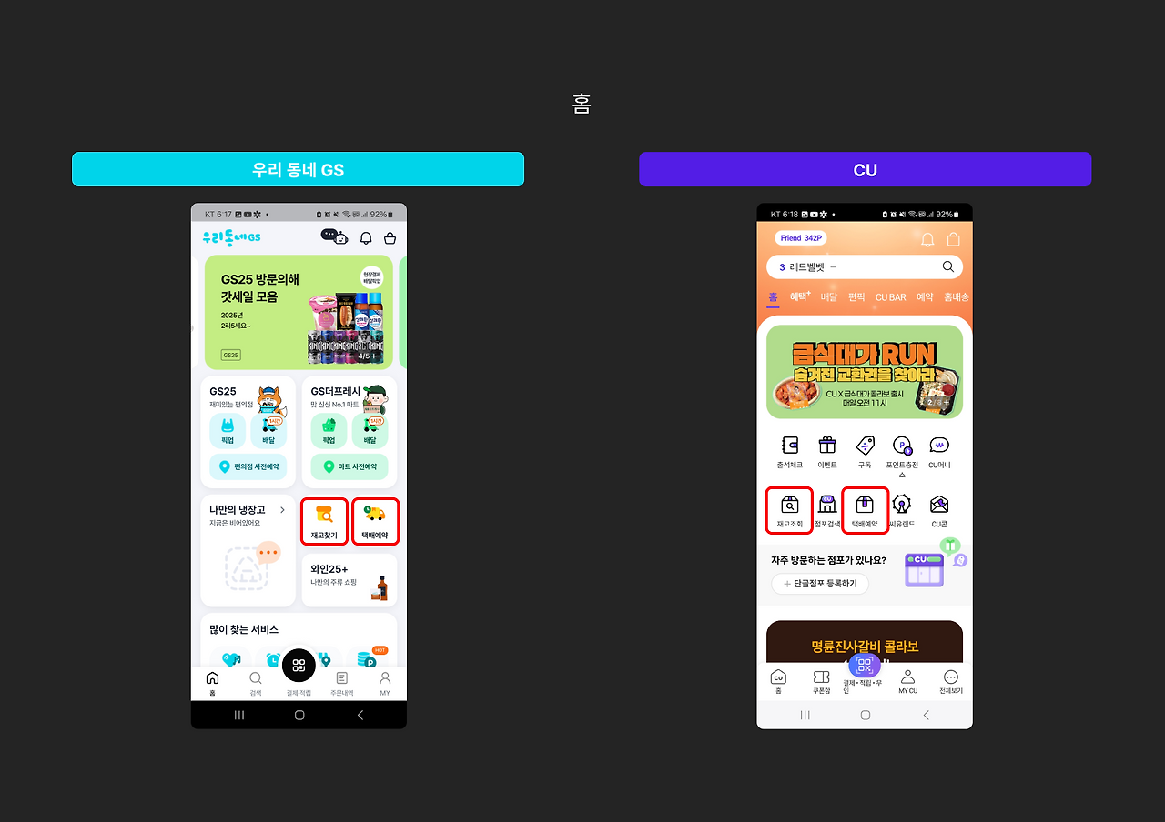 공통점 : 첫 화면에 재고조회와 택배예약 기능을 배치하고 있어, 많은 사용자들이 이 두 가지 기능을 자주 활용한다는 것을 알 수 있었습니다. 편의점의 다양한 신제품에 대한 관심이 높아지면서 재고 찾기 기능의 사용이 증가했으며 택배예약 서비스는 일반 택배사와 달리 24시간 이용이 가능하고 접근성이 좋아 바쁜 현대인들에게 큰 호응을 얻고 있습니다.