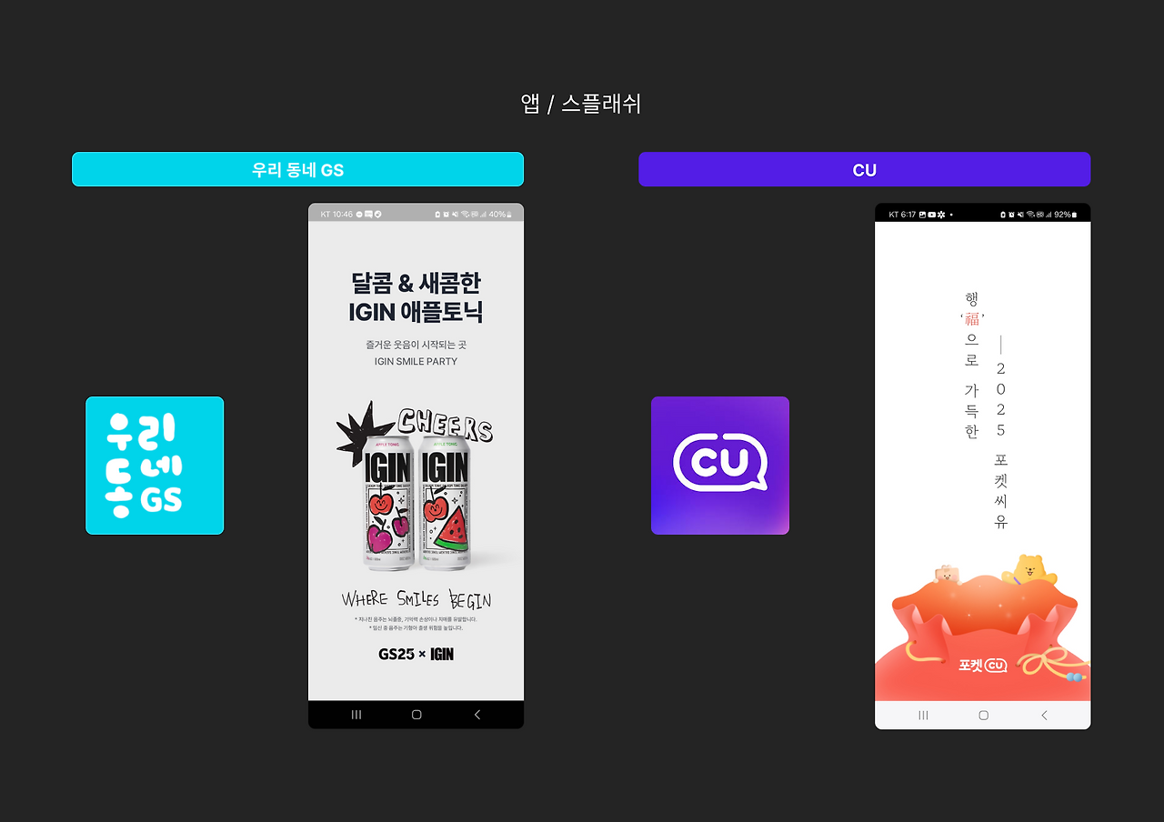 CU : CU 인사말처럼 말풍선 느낌을 주기 위해 아이콘 내에 'CU' 로고가 중심에 배치되어 브랜드 정체성과 가독성이 높다고 생각합니다. 또한 컬러 대비가 뚜렷해 한눈에 알아볼 수 있는 명확하였고 스플래쉬의 경우 캐릭터를 이용하여 새해와 설날 분위기를 강조하였습니다.