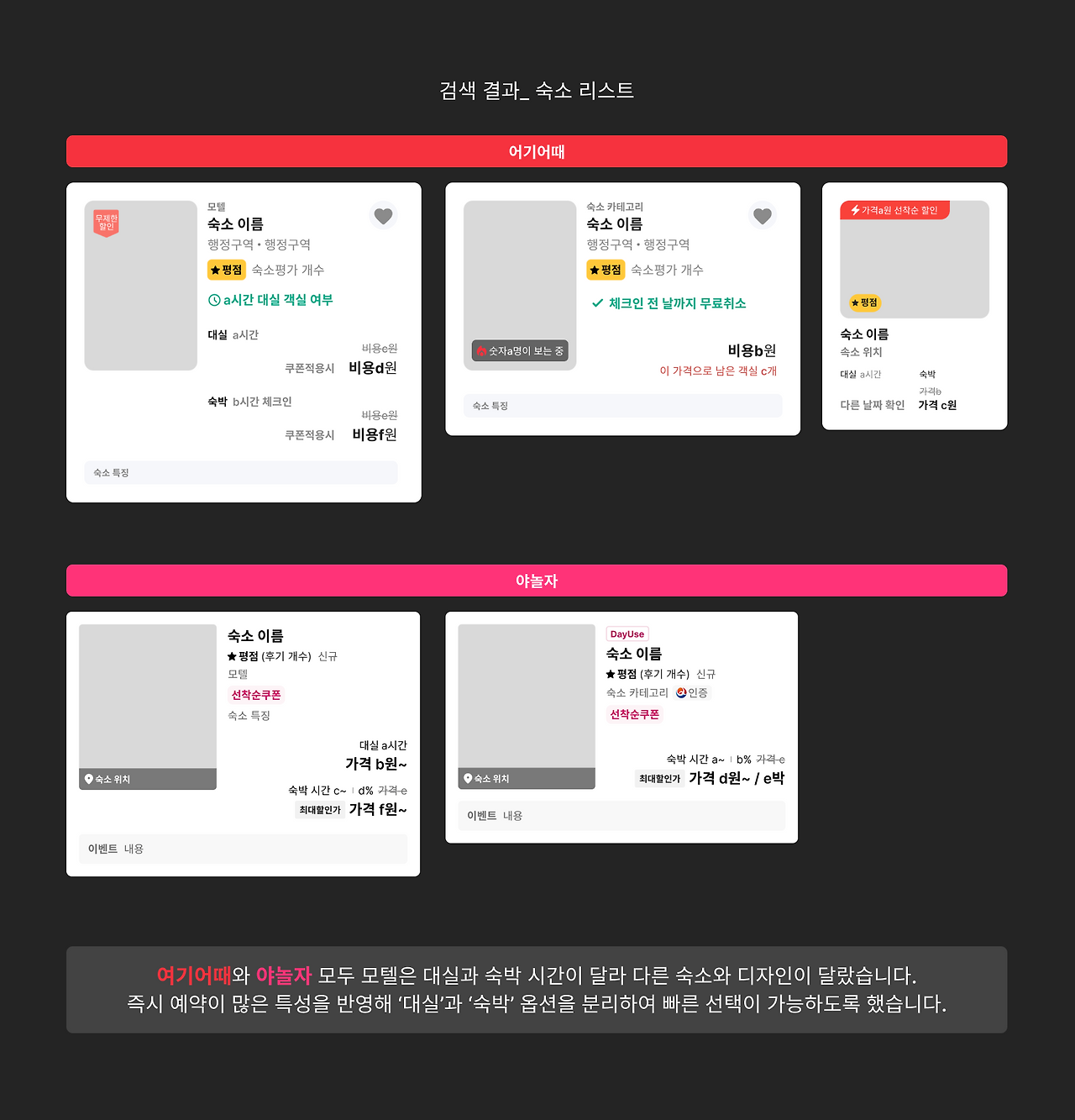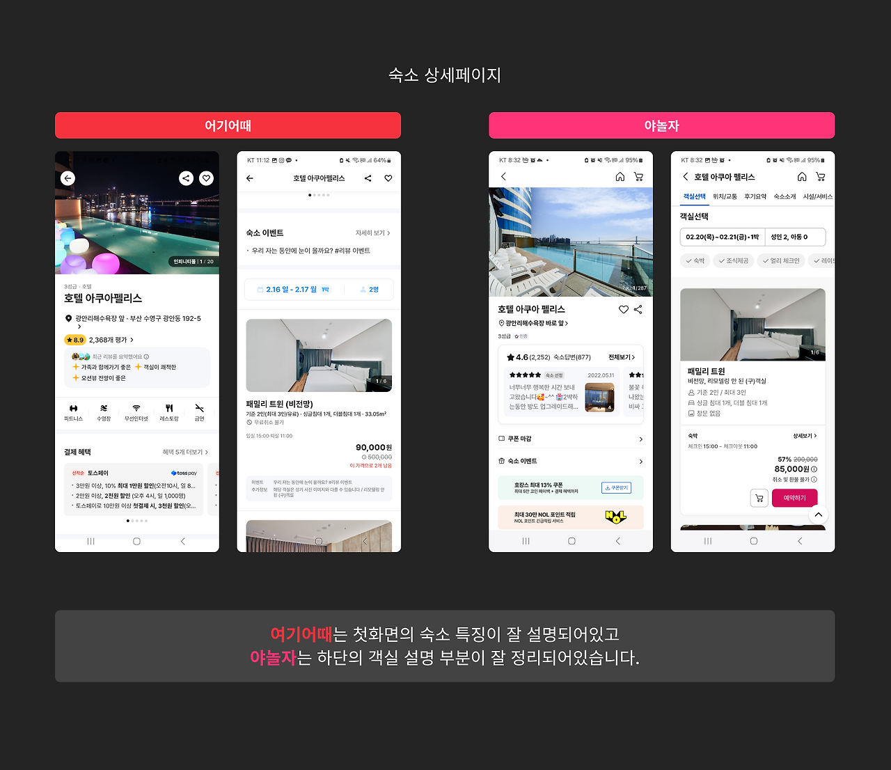 두 곳을 이용하면서 아쉬웠던 점이 있었습니다. 여기어때의 숙소 사진에 표시된 ‘무제한 할인’과 야놀자의 숙소 이름 위에 있는 ‘DayUse’ 및 ‘한국관광공사 인증 마크’에 대한 설명이 부족하다는 것이었습니다. 이것에 대한 추가적인 설명이 숙소의 이벤트 설명에 있거나 리스트에서 설명을 추가할 필요가 있습니다.