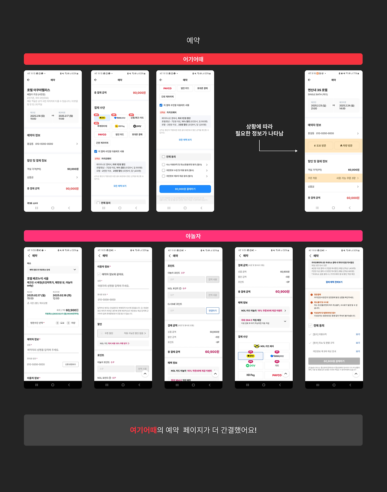 불필요한 정보가 많으면 사용자는 필요한 정보를 찾기 위해 더 많은 인지적 노력을 들여야 하고, 이는 예약 과정에서 혼란을 유발할 수 있습니다. 그러나 여기어때는 사용자에게 적용되지 않는 정보를 제거하여 필요한 정보만 빠르게 확인할 수 있도록 함으로써 더 직관적인 예약 경험을 제공하였습니다. 이를 통해 사용자는 불필요한 고민 없이 예약에 집중할 수 있었고 단순히 화면을 깔끔하게 정리하는 것이 아닌 실제 사용자 경험을 개선하는 전략적인 접근이 돋보였습니다.