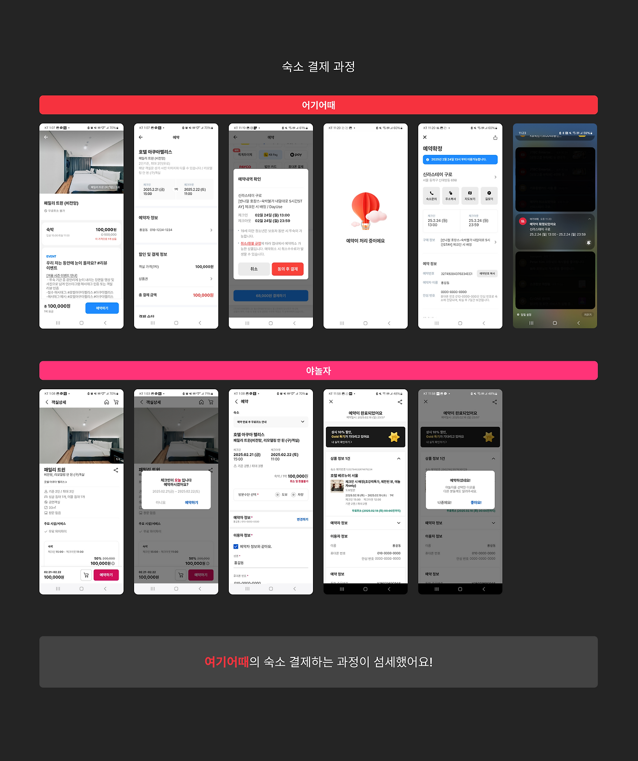 (GOOD) 숙소 예약 후에는 결제 확인 단계가 있으며 팝업 형태로 예약 내역을 다시 확인하도록 유도하여 사용자가 최종적으로 정보를 점검할 수 있도록 설계되었습니다. 결제가 완료된 후에는 "예약 처리 중" 화면이 표시되며 열기구가 구름 사이를 둥둥 떠다니는 애니메이션을 통해 기다리는 동안 설렘을 느낄 수 있도록 디자인되었습니다. 이러한 시각적 요소는 사용자의 지루함을 줄이고 기대감을 높이는 역할을 합니다.