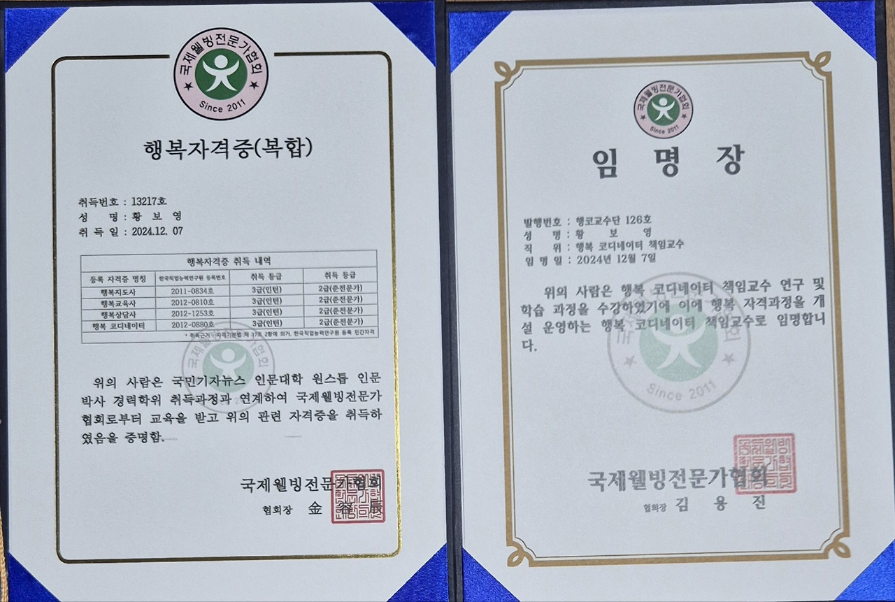 이는 학력이 아닌 경력 학위로 대한민국 최초의 행복 교수 민간 자격증을 받을 수 있는 제도가 마련된 것이다.