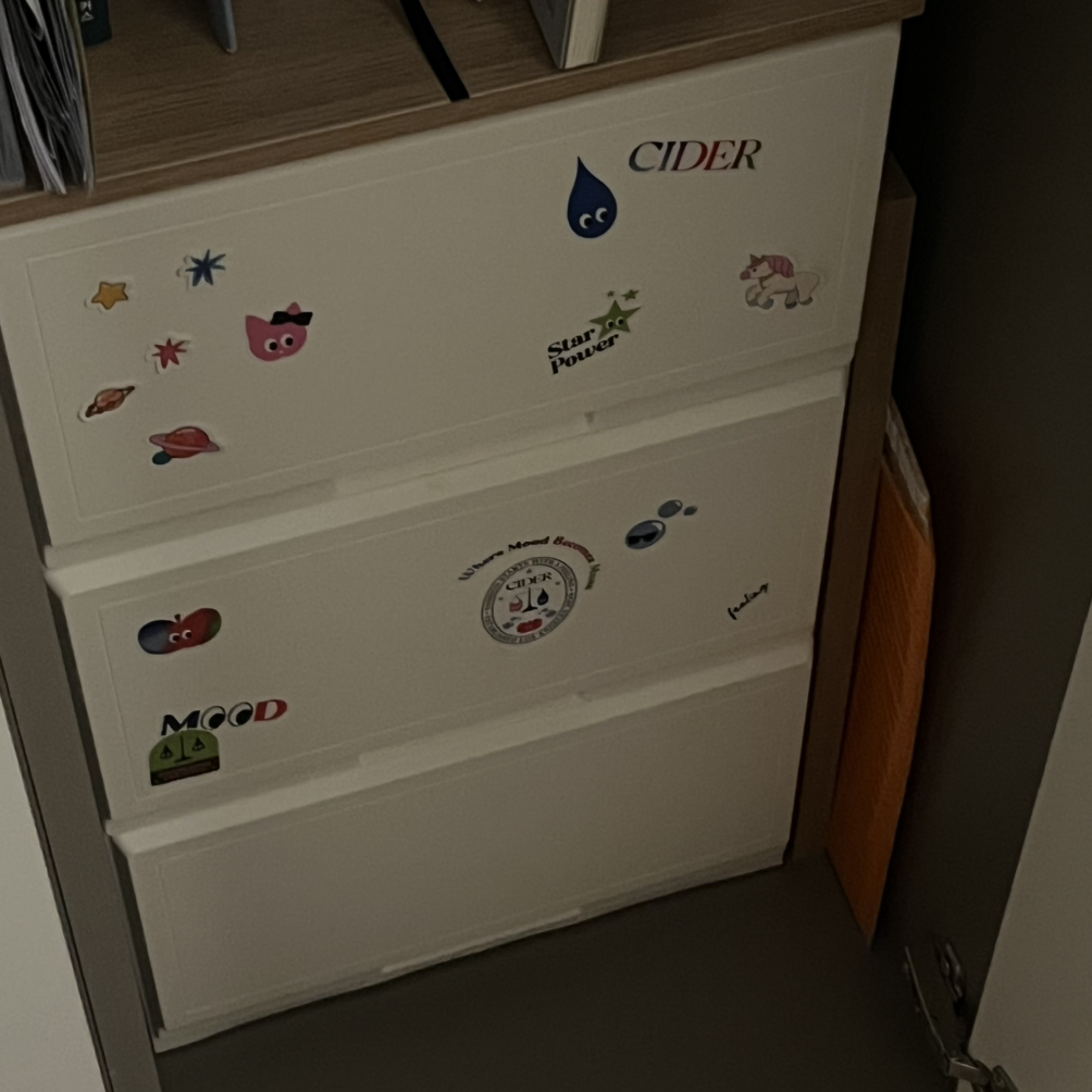 샵사이다에서 받은 스티커. 잘 떨어지곤 했는데 언제부턴간 곧줄 제자리를 지키고 있다. 서랍 안에는 생활용품이 들어있다. 벽장 안.