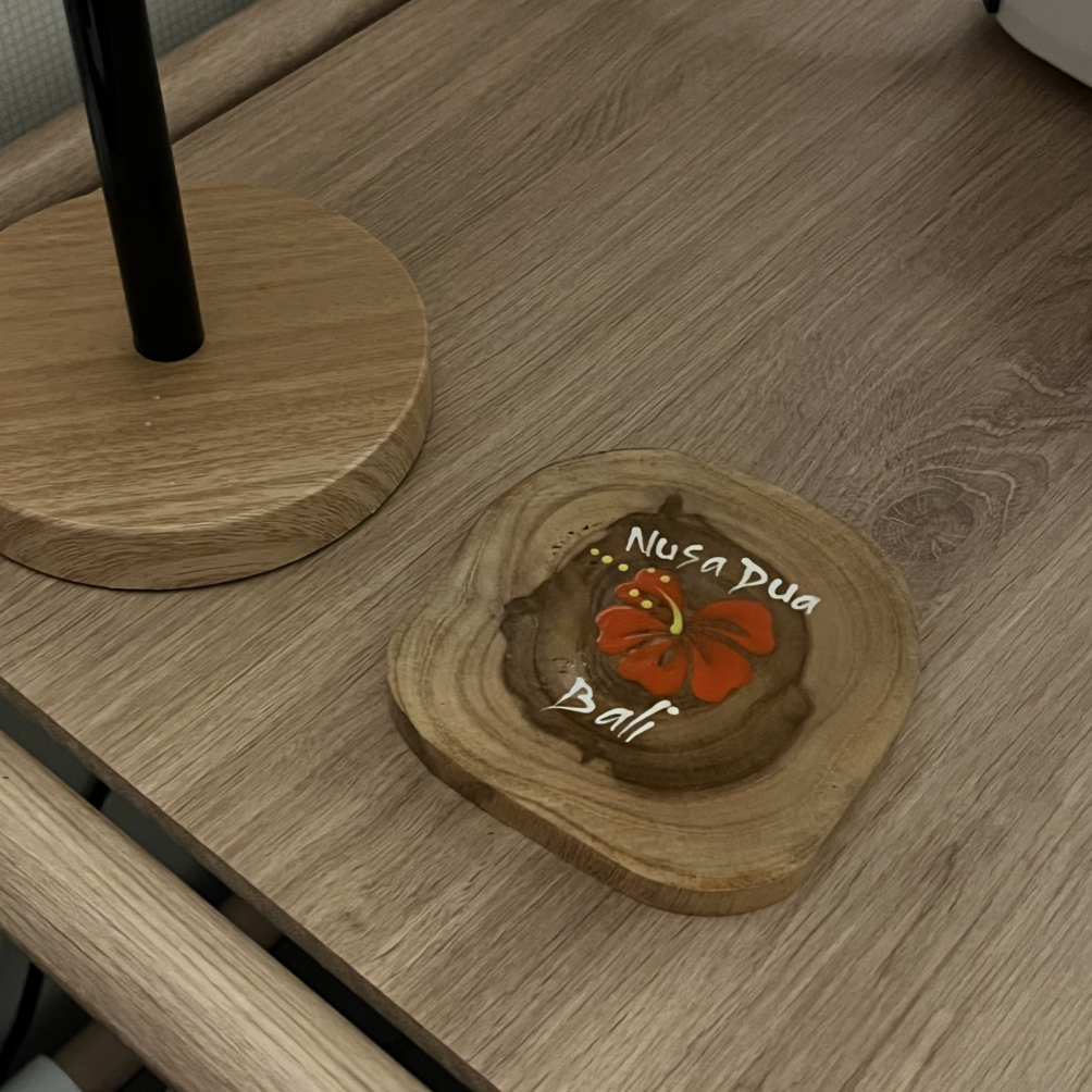 Nusa Dua에서 산 컵받침인데 가격표를 떼다가 글자 일부가 날라가서 오늘 수정펜으로 글자를 다시 완성시켰다! 다용도선반 중간칸, 방구석.