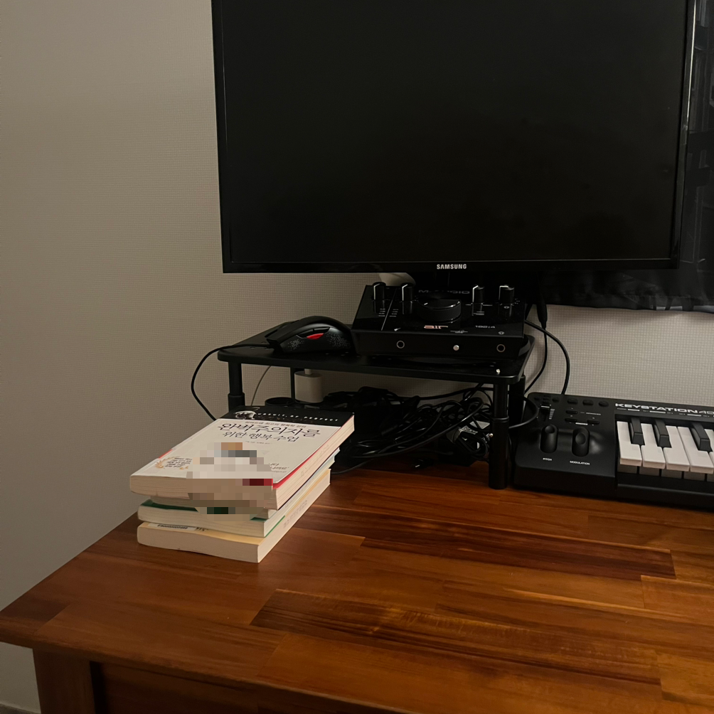 고무나무 책상. 1200cm. 전반적인 인테리어와 색이 다르나 어두운 조명과 어울려 거슬리지 않는다. 질리지도 않고, 색이 어두워서 책 볼 때 눈이 편하다.
