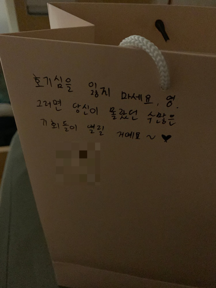 내가 다음 학기에 네덜란드로 교환학생을 가게 되면서, 기숙사를 떠나야 하는 날이 되었다. 룸메이트는 이제 석사를 졸업하고 요르단으로 돌아갈 것이라고 했다. 그렇게 같이 보내는 마지막 날이 되었다. 퇴근하고 방에 돌아오니, 내 침대에는 선물이 하나 놓여 있었다. 그리고 그 선물 봉투에는 한글로 꾹꾹 눌러 적은 짧은 편지가 쓰여 있었다.