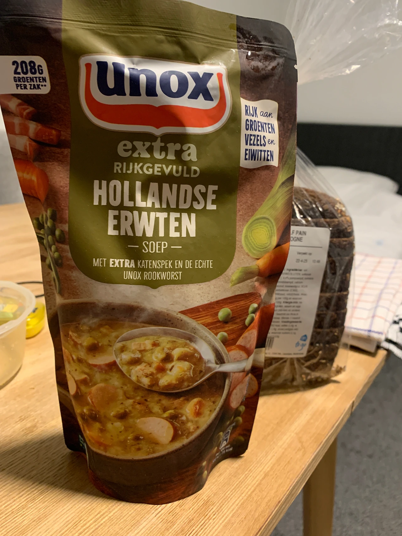 에르텐 수프를 만들어 먹었으면 더 좋았겠지만, 나에게는 그만큼의 지금 마음의 여유와 시간적 여유가 없었기 때문에, 간단하게 데워서 먹을 수 있도록 하는 방법을 선택했다. 그래도 수프만 먹을 수는 없으니까 호밀빵까지 사와서 옆에 한자리를 차지하게 했다. 네덜란드 친구한테 물어보니까 이런 갈색빛이 도는 호밀빵과 같이 먹는다는 추천을 받았기 때문이다!