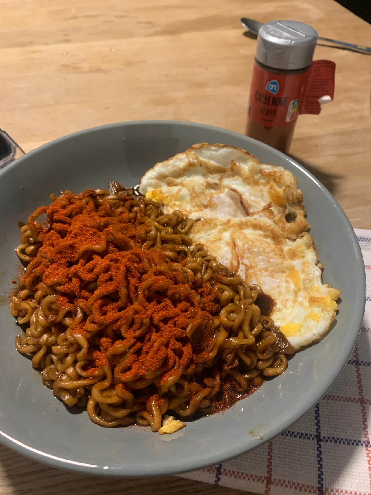그리고 무엇보다도 짜파게티는 매콤한 맛으로 먹는 게 매력이기 때문에, 마트에서 고운 고추가루도 하나 사왔다. 짜파게티만 먹으면 살짝 아쉬운 나에게는 계란 2개는 최고의 짝꿍이다. 이렇게 플레이트와 체크무늬 패브릭 위에 두고 먹으면, 단지 라면일 뿐이라도, 나에게 주는 최고의 한끼가 된다.